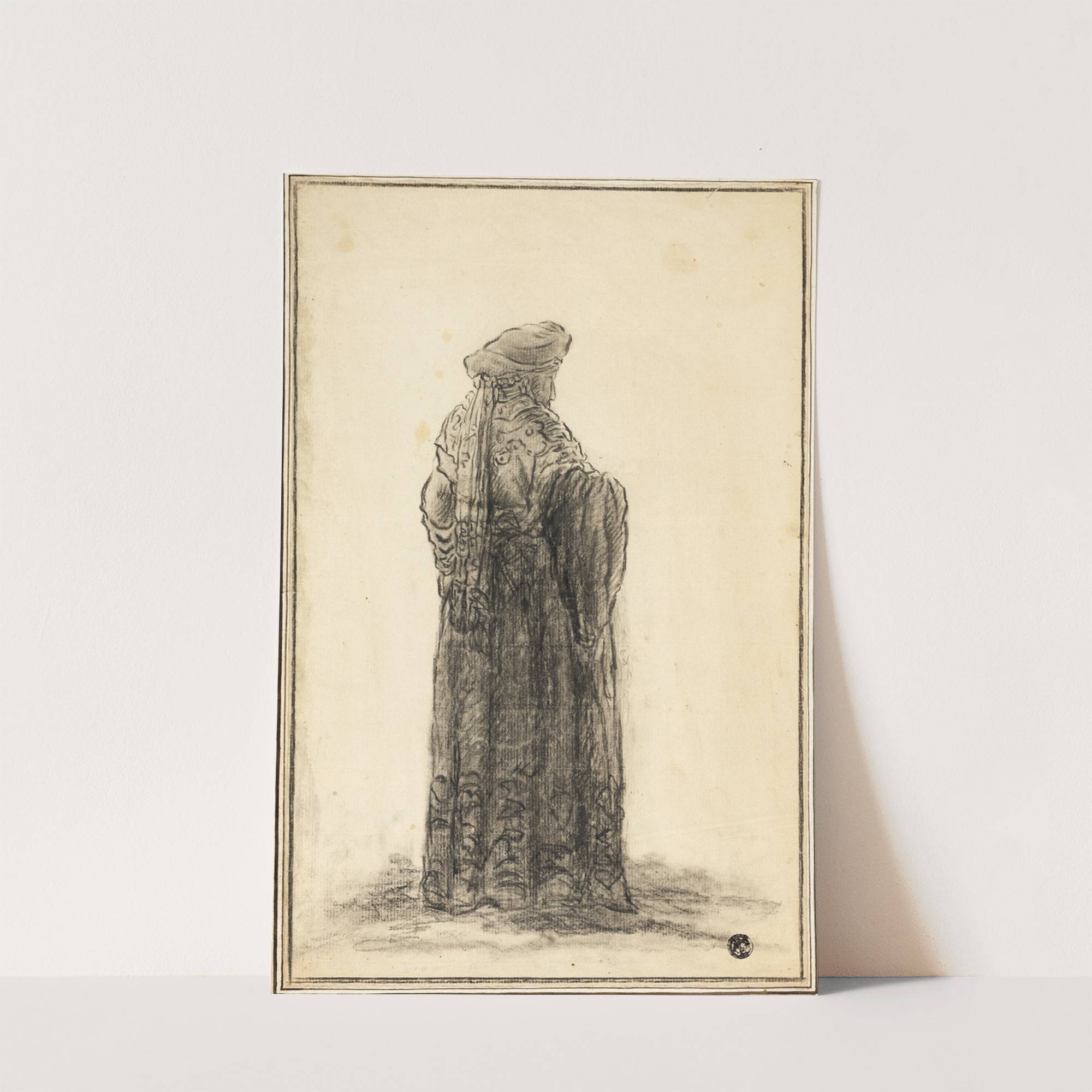 This elegant artwork, "Jewish High Priest" by artist Adam Sandor Ehrenreich, showcases a beautifully rendered figure in monochromatic ink. The subject stands facing away from the viewer, allowing a clear view of their intricate attire and distinctive headdress. The long,...