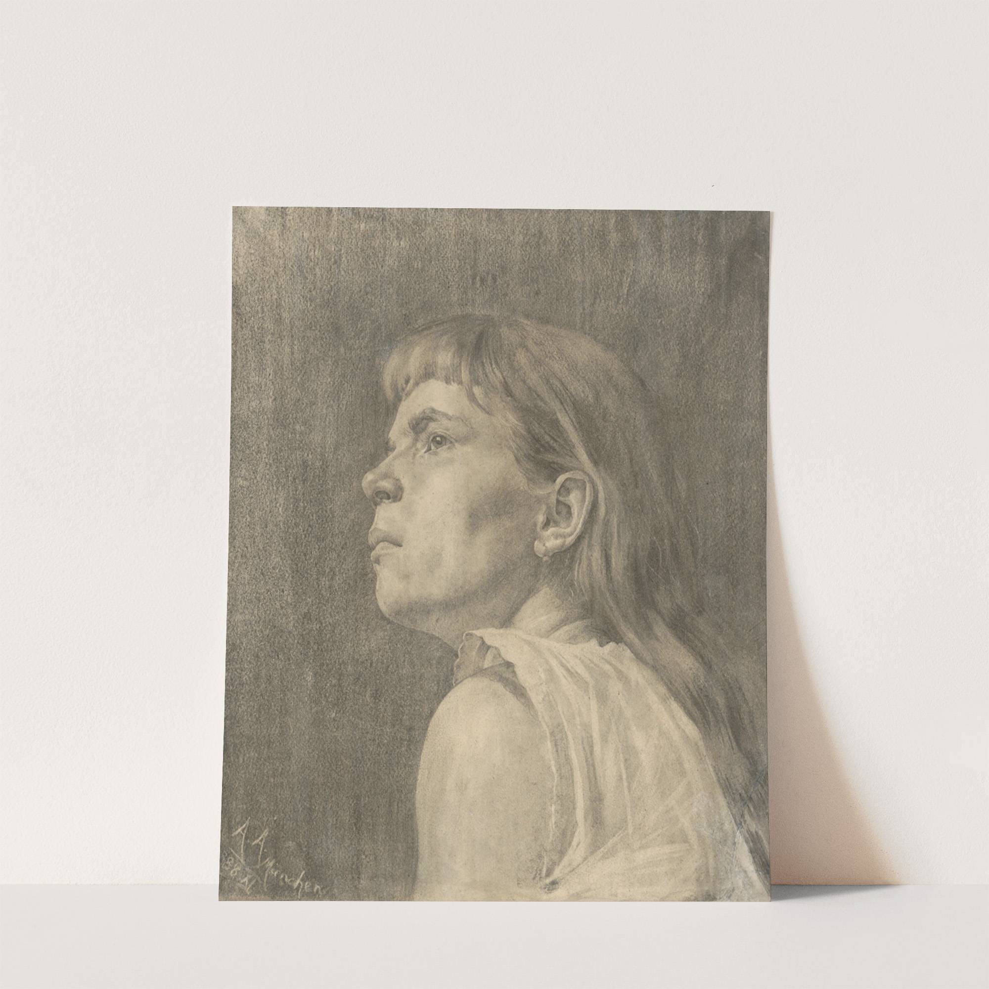 This art print features a finely detailed grayscale drawing of a young woman in profile, captured in soft, muted tones that highlight the delicate textures of her hair and skin. The artist, Ákos Aranyossy, has expertly used subtle shading to...