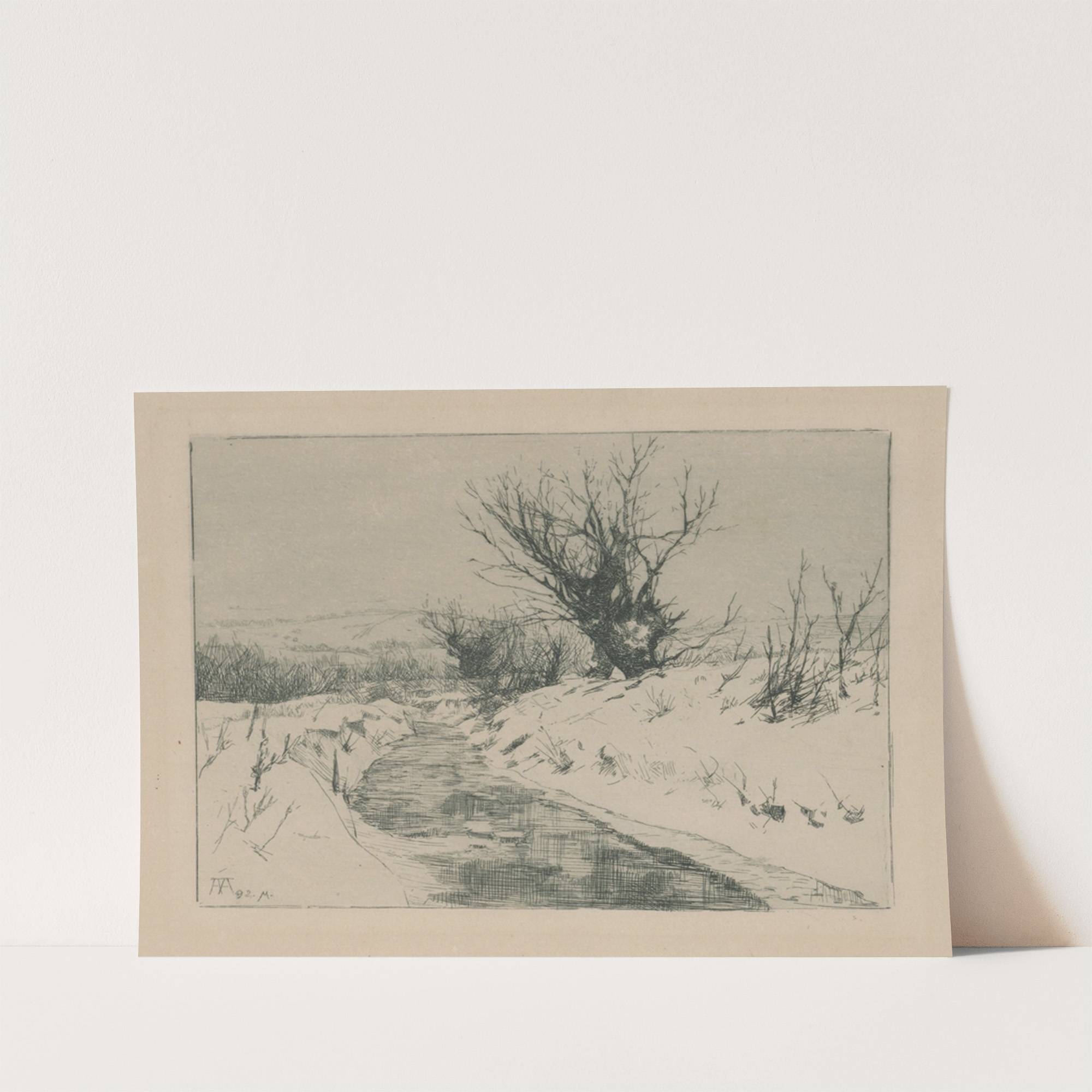 This exquisite black-and-white etching titled "Potok v zime" (Stream in Winter) by Ákos Aranyossy beautifully captures the tranquil essence of a frozen stream winding through a snowy landscape. The delicate line work and cross-hatching technique used by the artist add...