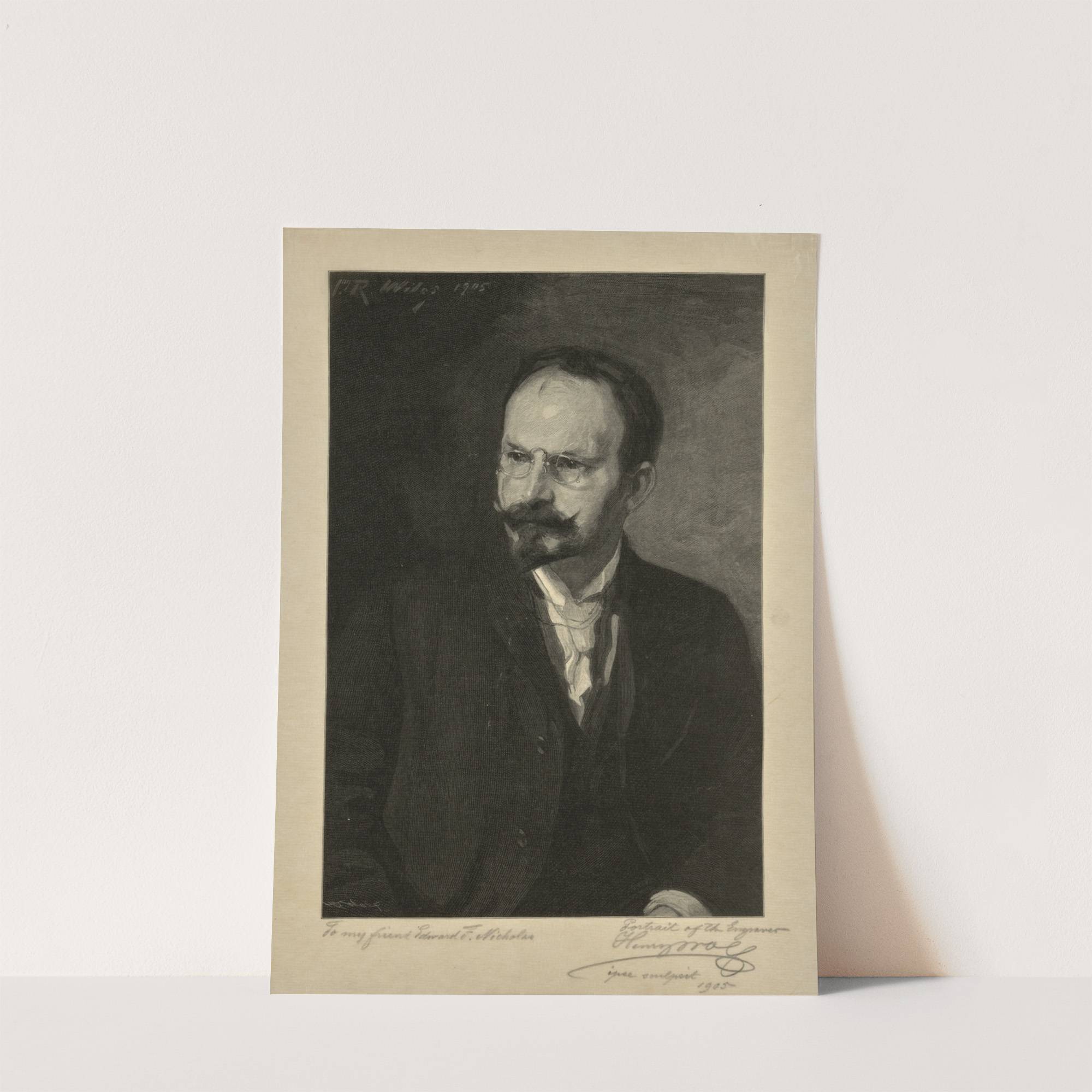 This art print features a classic black-and-white self-portrait of Henry Wolff from 1905. The image captures the artist in a dignified pose, standing against a dark background that highlights his face with striking contrast. His expression is thoughtful and introspective,...