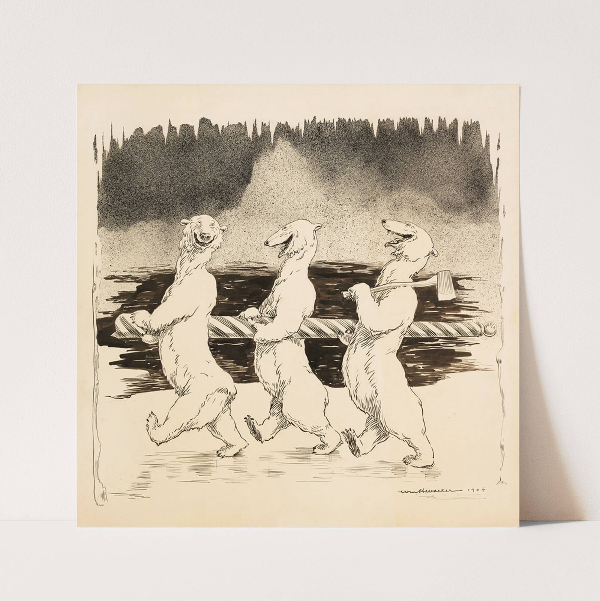 Three polar bears who have stolen the sign for the North Pole. (1906) by William Henry Walker - Wall Art Print