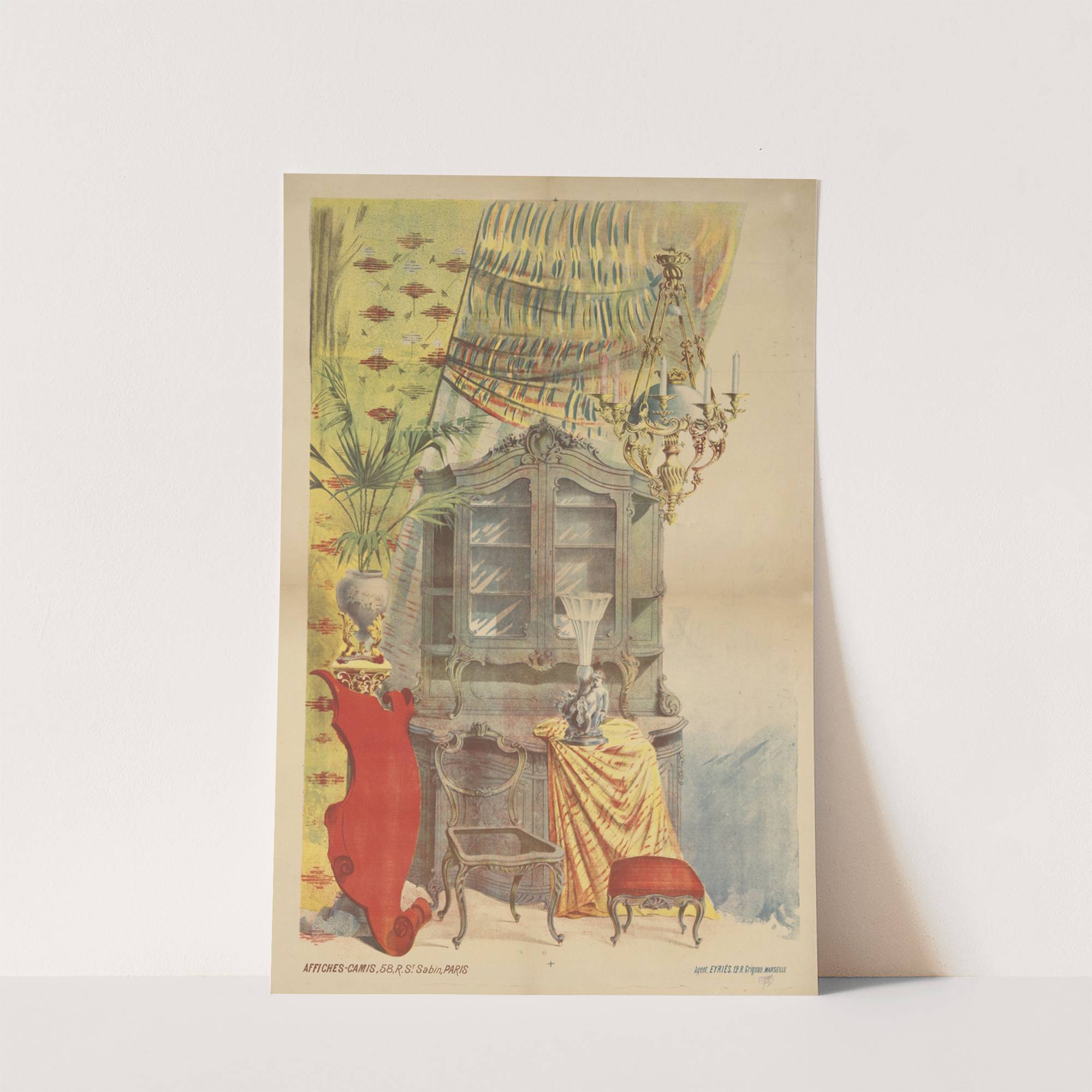 Intérieur d’un salon avec un buffet, un lustre, des rideaux, une plante, une chaise (1892) by Imp. Camis - Wall Art Print