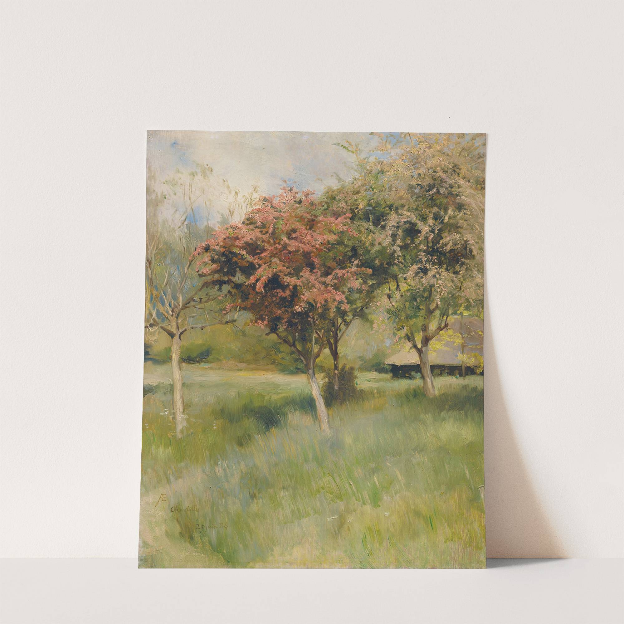 This beautiful art print features "Blommande hagtorn (Vy från Chantilly)" by Albert Edelfelt, capturing a serene garden scene in stunning detail. The composition centers around three trees with varying foliage: the left tree is bare, while the middle and right...