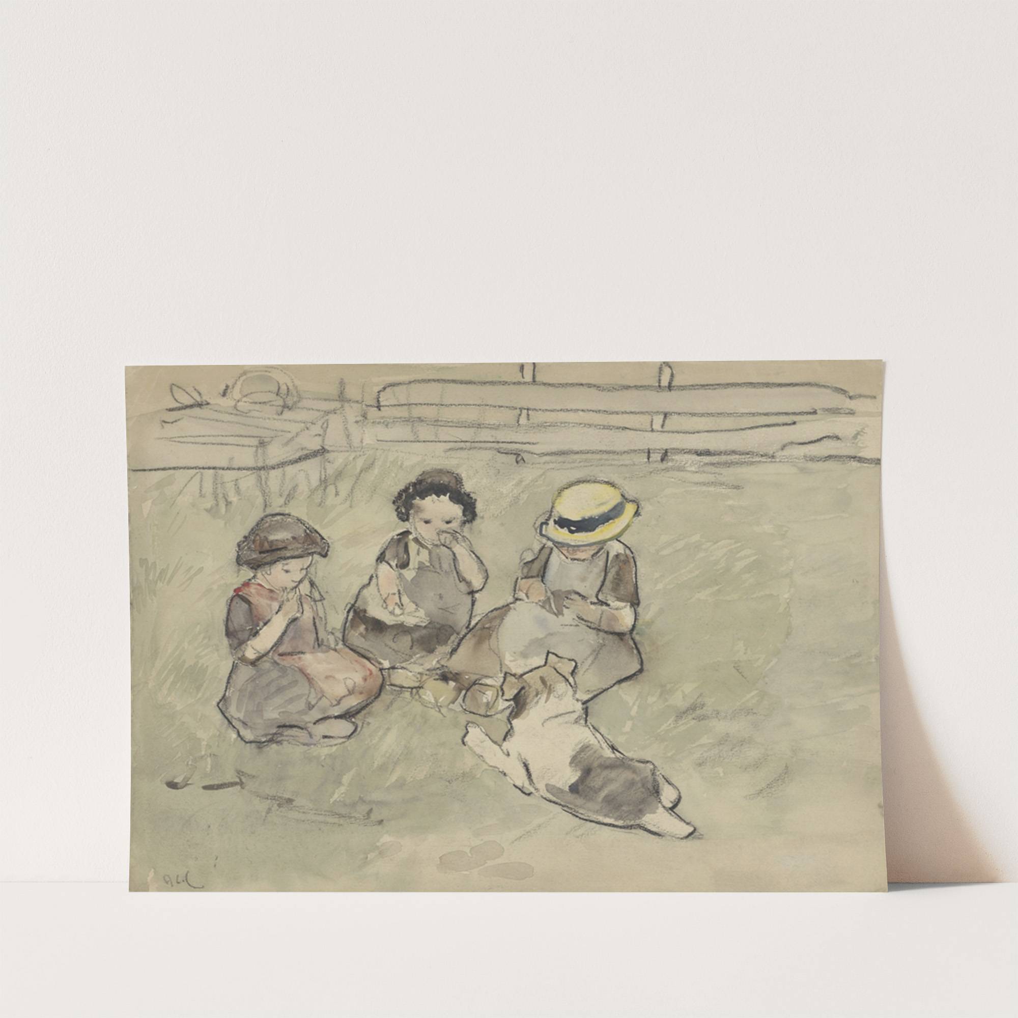 This charming watercolor painting by Adolf Le Comte titled "Drie meisjes met een hond zittend in een weiland" evokes a nostalgic rural setting. The scene features three young girls sitting on the grass, each absorbed in their own thoughts or...
