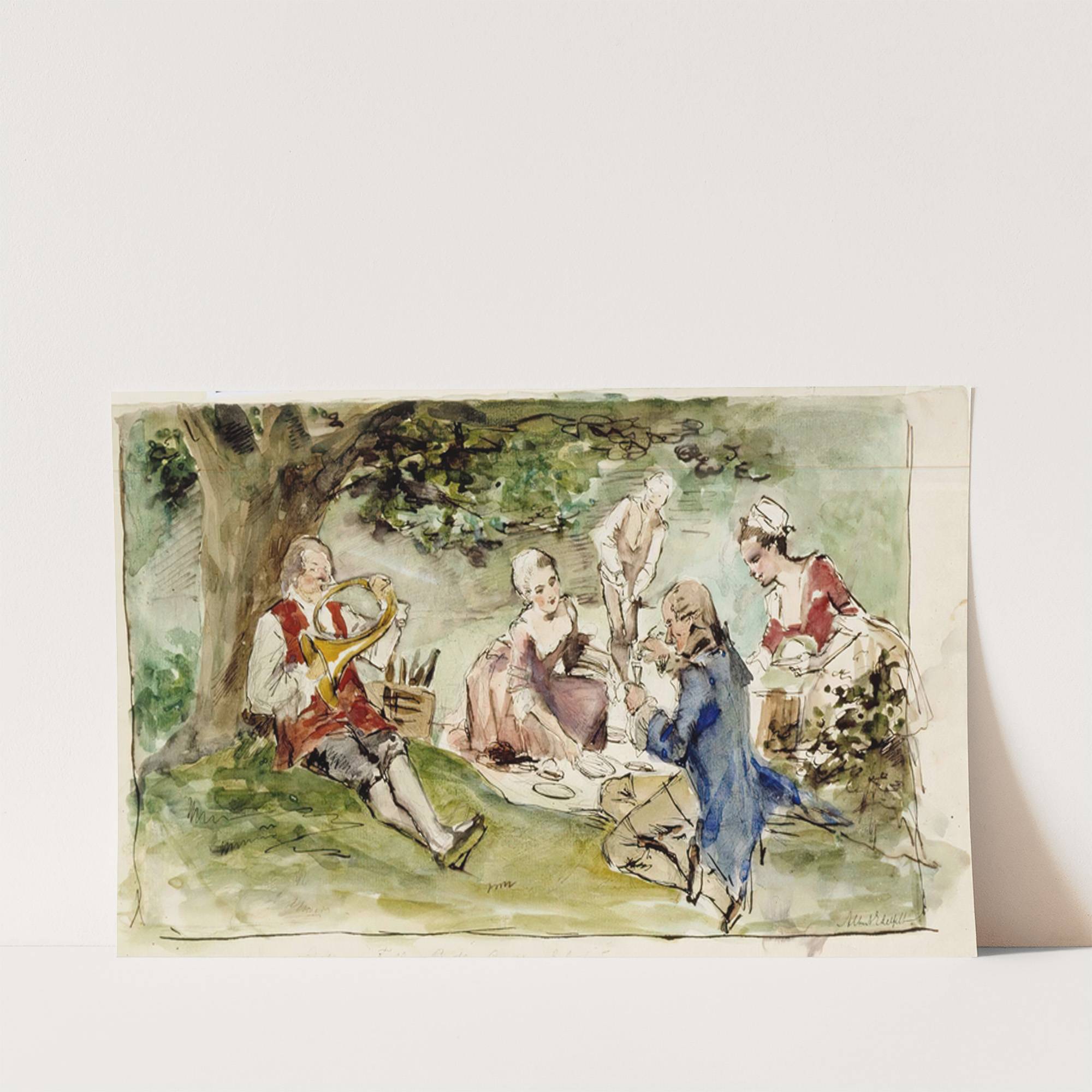 This art print features "Huvila lähteen vierellä, harjoitelma" by Albert Edelfelt, showcasing a charming pastoral scene rendered in a delicate watercolor style. The composition depicts a serene outdoor gathering of six characters under the shade of a large tree. On...