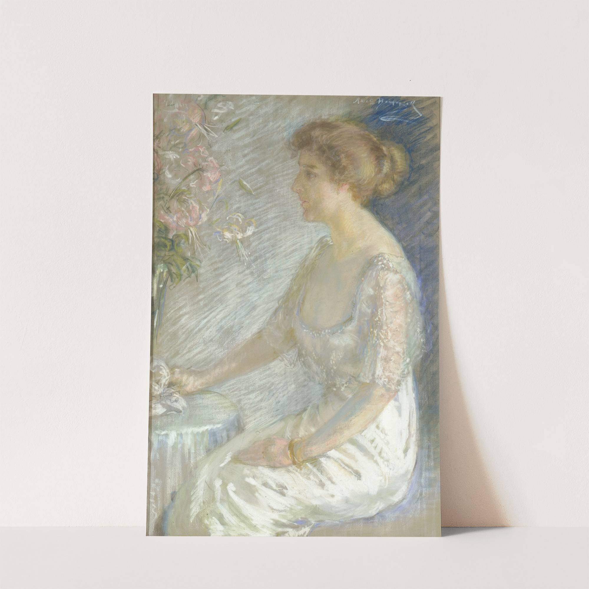 This art print features a delicate and charming portrait of a woman in profile view, beautifully rendered with soft, impressionistic brushstrokes. The artist, Katherine Hemmick Johnson as interpreted by Alice Pike Barney, captures the ethereal beauty of her subject through...