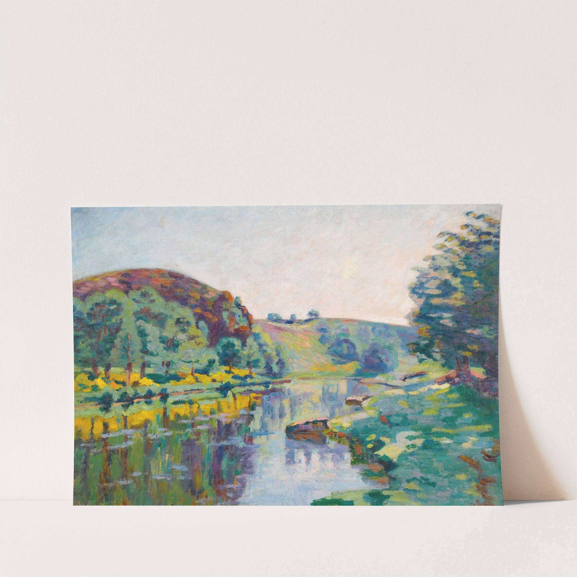 This vibrant art print features "La Roche De L'Echo" by Armand Guillaumin, a beautiful impressionist painting that captures the serene beauty of a riverside landscape. The composition includes a calm river reflecting the colorful surroundings in a mesmerizing way. On...