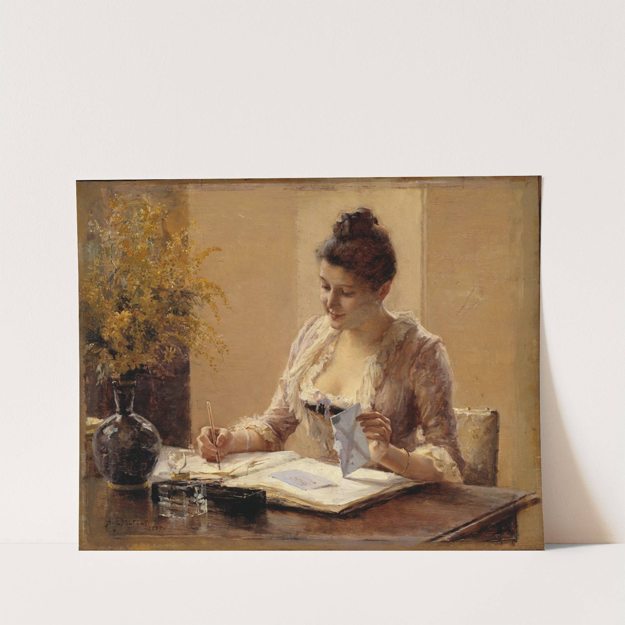 This art print features "Lady Writing a Letter" by Albert Edelfelt, showcasing a beautifully detailed and realistic painting with warm, earthy tones. The central figure is a young woman with fair skin and dark brown hThe woman is seated at...