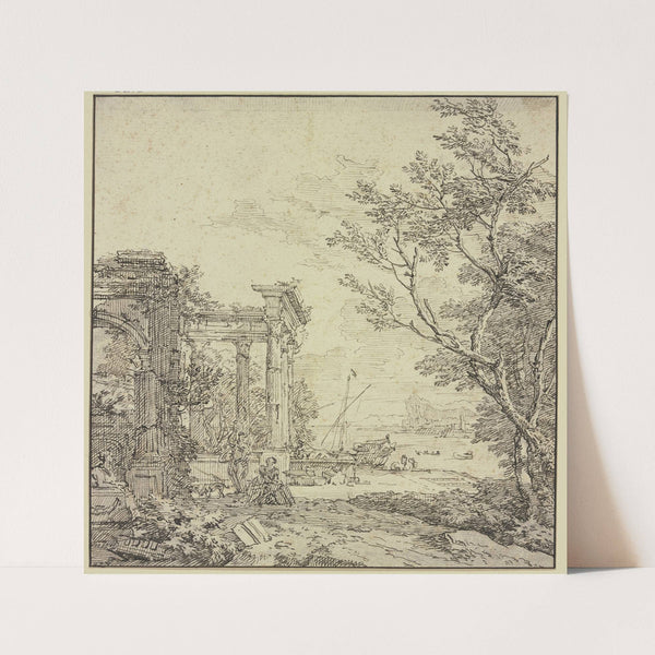 Antike Trümmer an einem Fluss, links eine Sphinx by Isaac de Moucheron - Wall Art Print