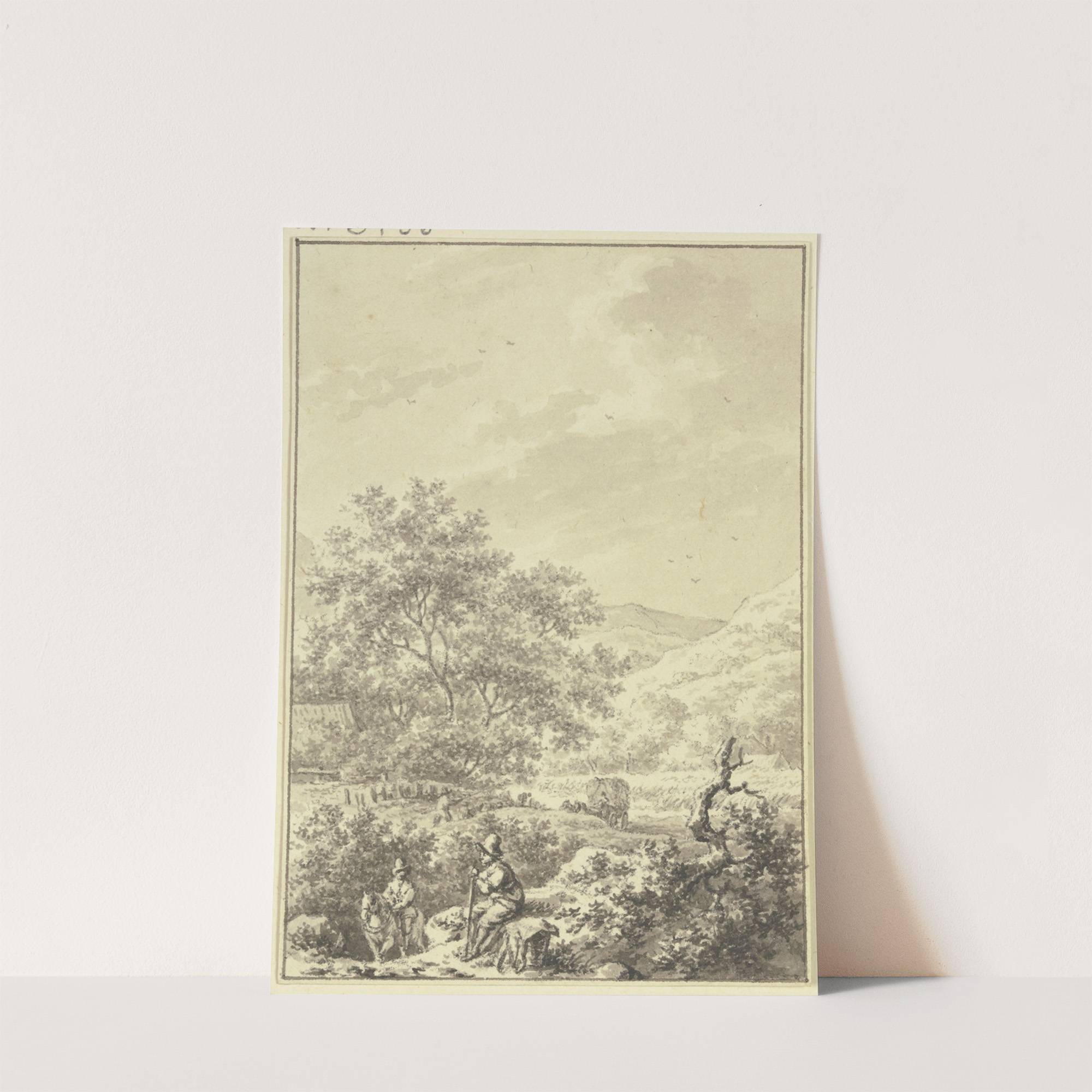 In einem Hohlweg ein Reiter, vorne ein ruhender Wanderer bei einem Tragkorb by Jacob Cats  - Wall Art Print