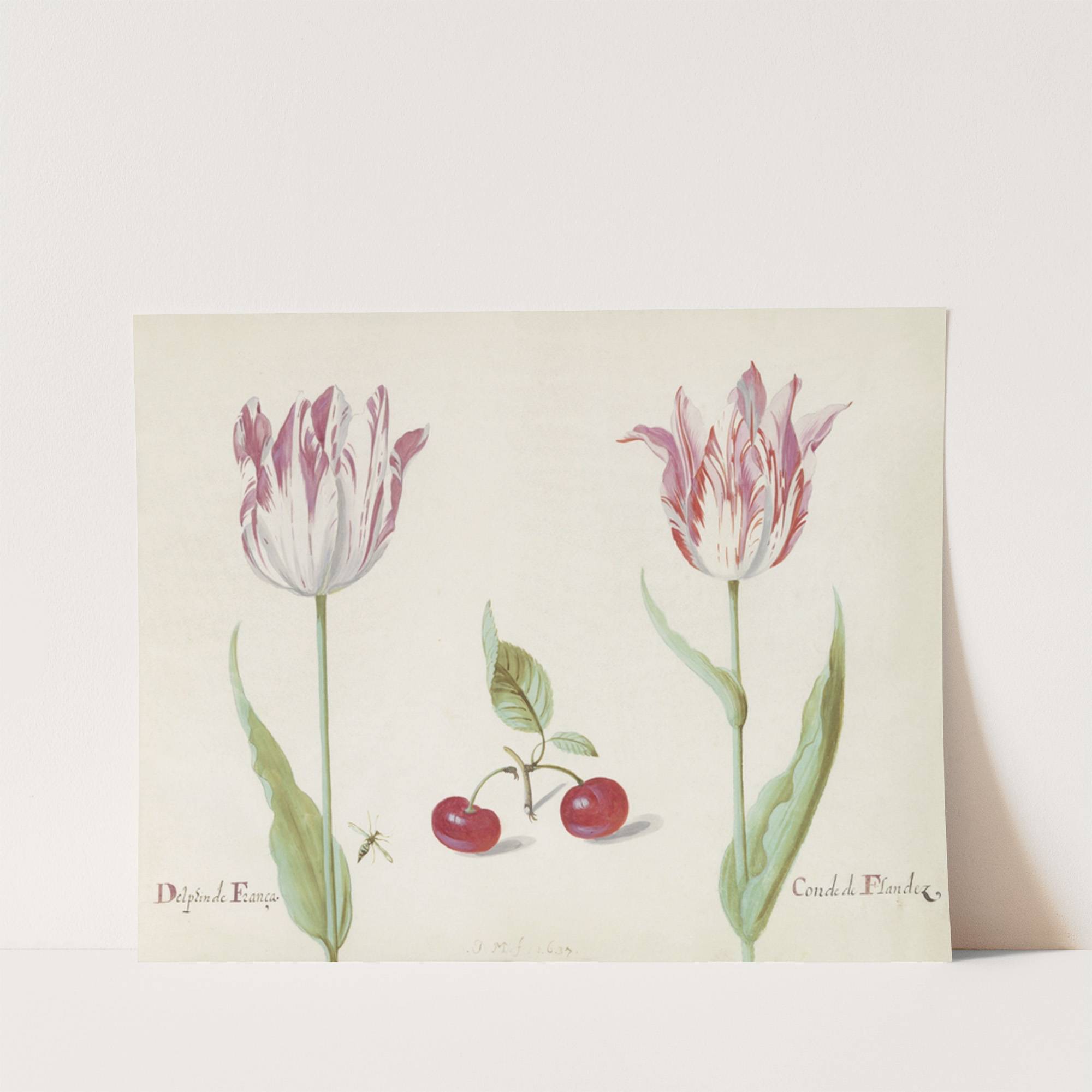 Twee tulpen met twee kersen en vlieg Delphin de Franca Conde de Flandez (1637) by Jacob Marrel - Wall Art Print
