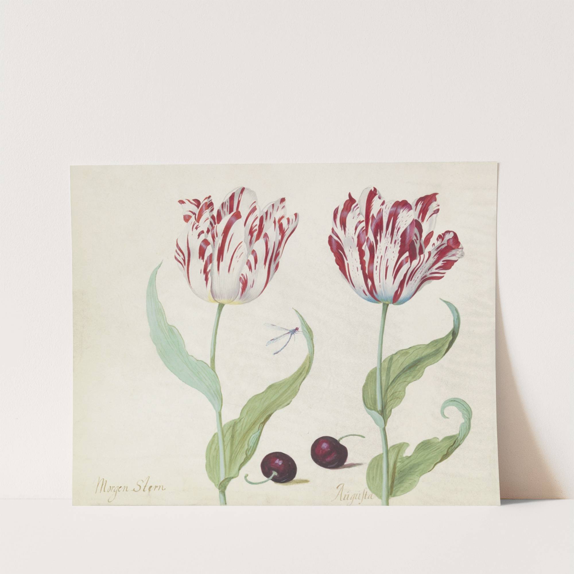 Twee tulpen met twee morellen en waterjuffer Morgen Stern Augusta (1637) by Jacob Marrel - Wall Art Print