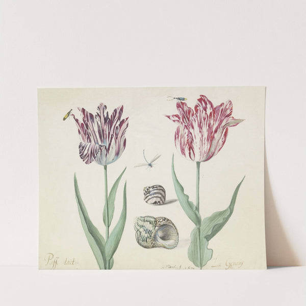 Twee tulpen met twee schelpen, twee kevers en waterjuffer Passe tout La Genouij (1637) by Jacob Marrel - Wall Art Print