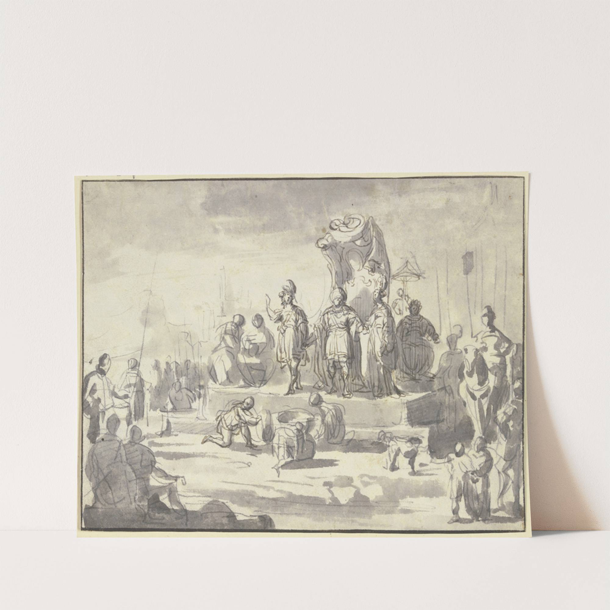 Unter freiem Himmel vor einem Thron steht ein Fürst zwischen einem jungen Paar by Jacob van der Ulft - Wall Art Print