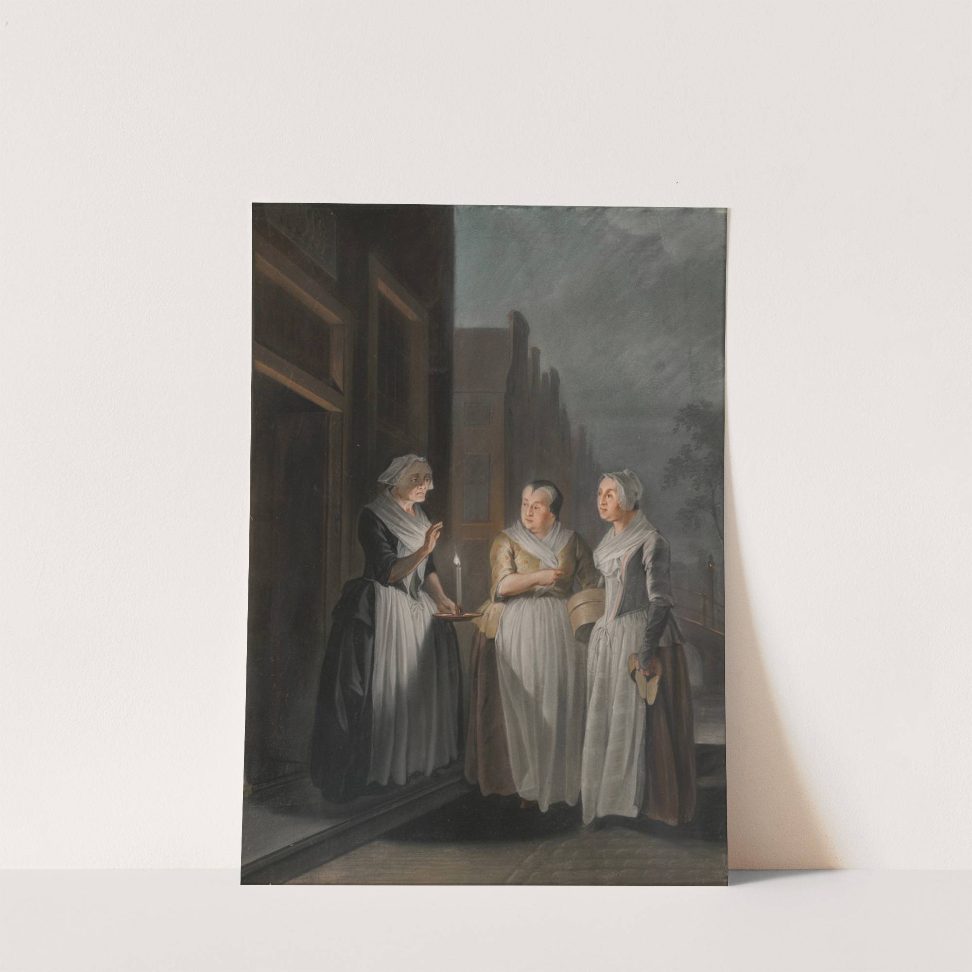 Three women talking at night in a Dutch city, one holding a candle by Jacobus Buys - Wall Art Print
