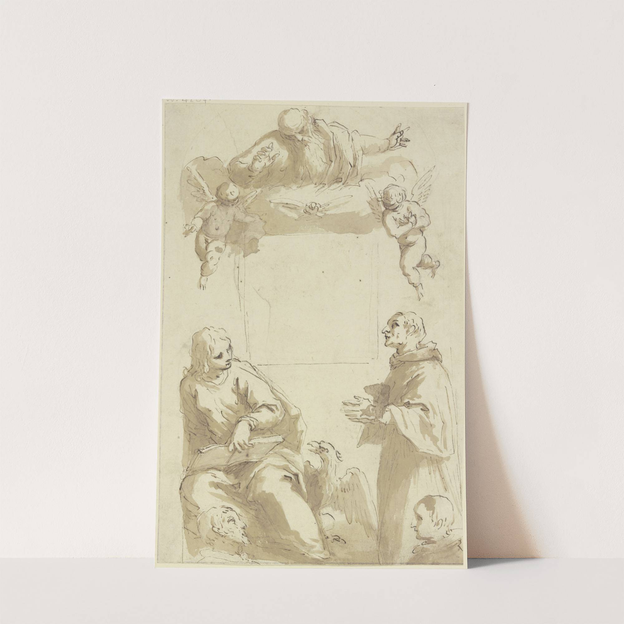 Gottvater mit Taube und Engeln über leerem quadratischem Feld, darunter Johannes der Evangelist und ein anderer anbetender Heiliger sowie die Köpfe von zwei Stiftern by Jacopo Palma il Giovane - Wall Art Print