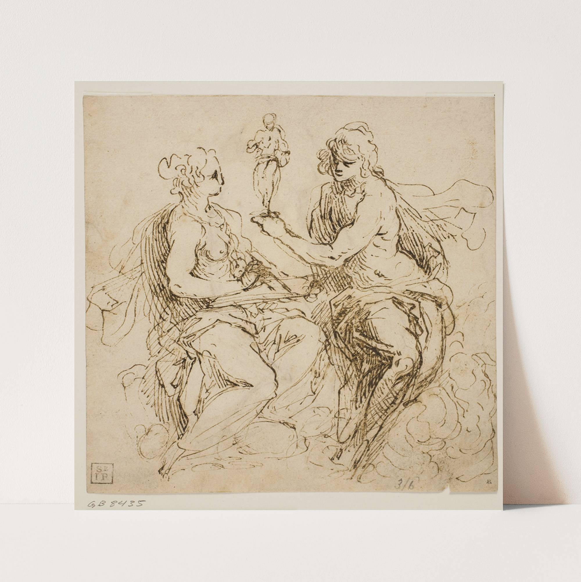 Personifikationer af malerkunsten og billedhuggerkunsten siddende på skyer by Jacopo Palma il Giovane - Wall Art Print