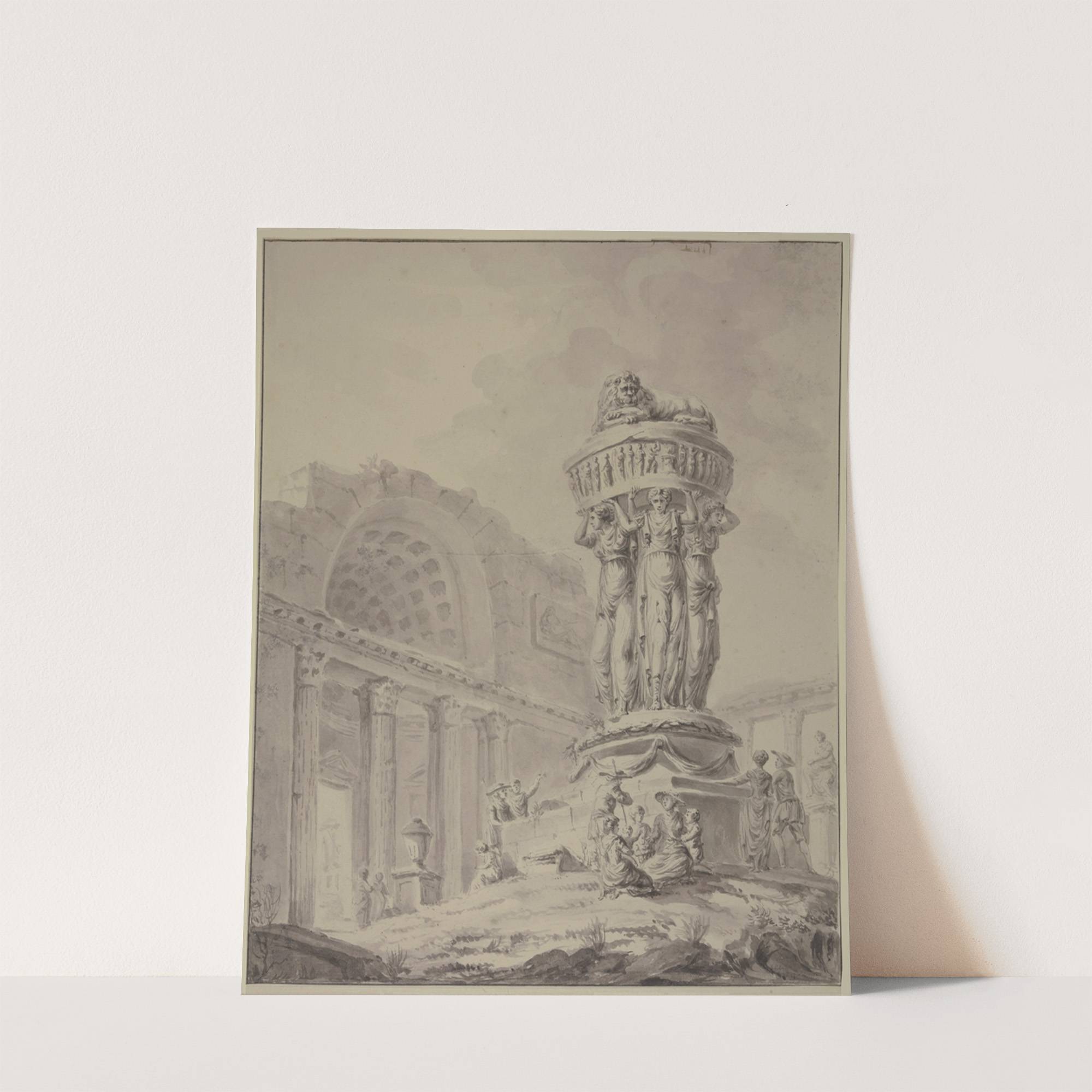 Zwischen Resten eines römischen Prachtgebäudes tragen drei kolossale Karyatiden eine Vase mit einem Löwen by Jacques-François Blondel - Wall Art Print