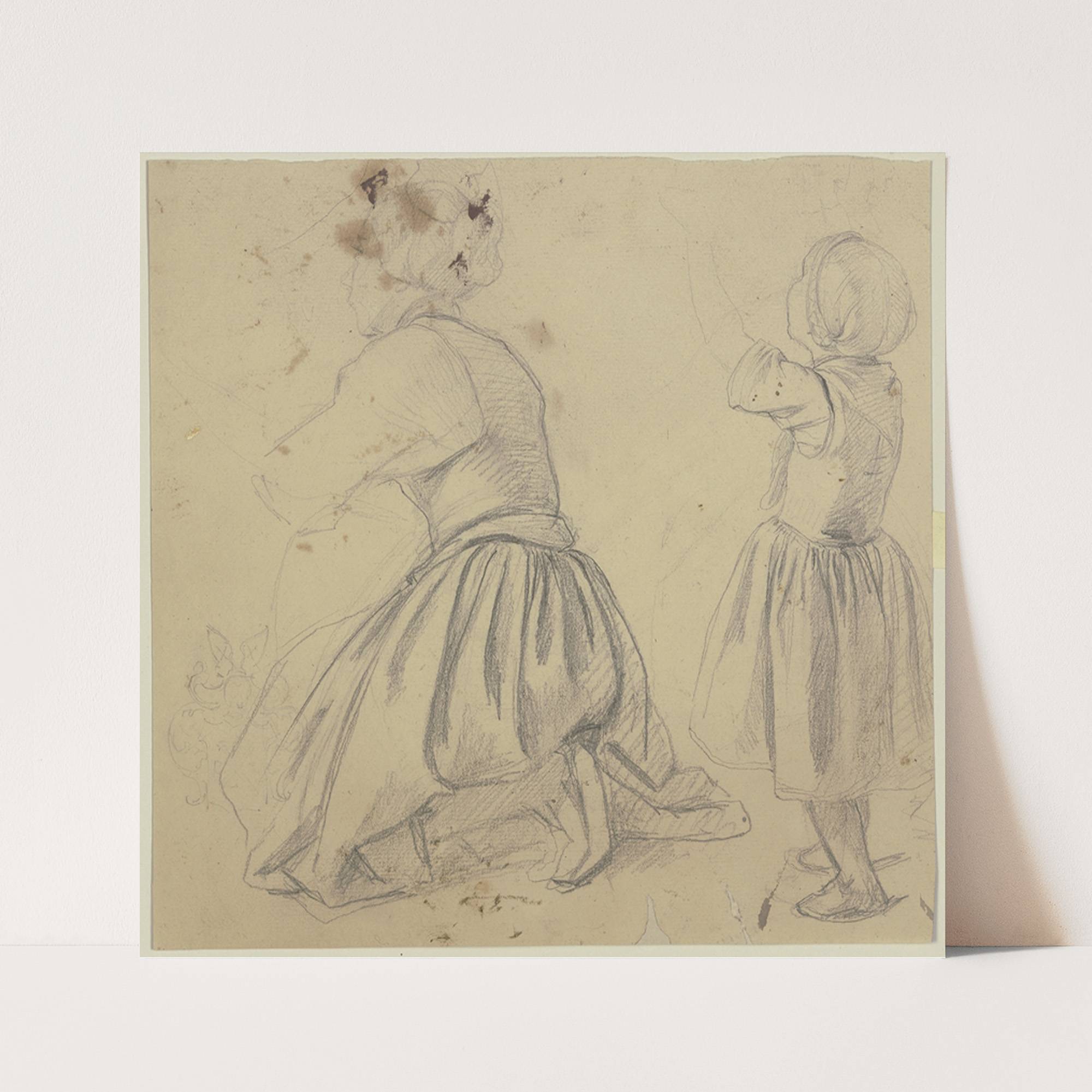 Studienblatt; Rückansicht einer auf dem Boden knienden Frau im verlorenen Profil und eines kleinen Mädchens mit erhobenen Armen by Jakob Becker - Wall Art Print