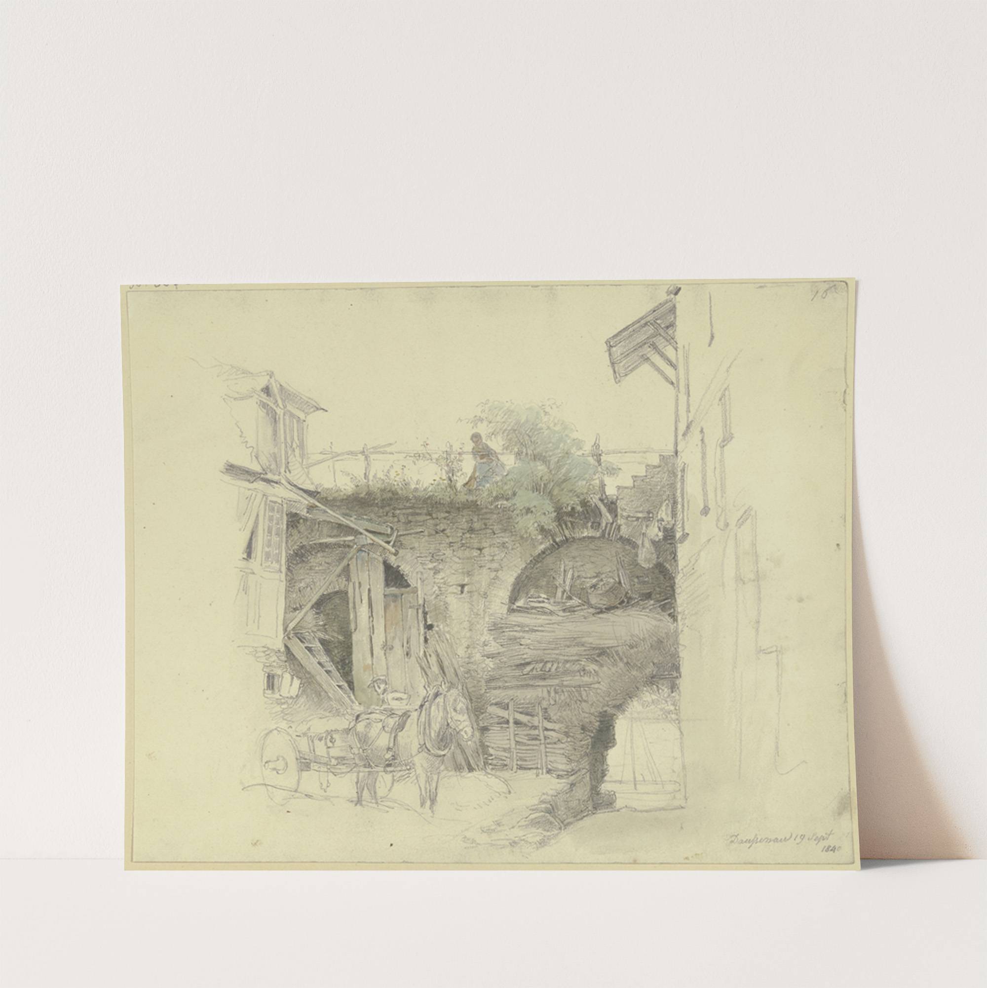 An der Stadtmauer hält ein Wagen, oben begießt ein Mädchen ihre Blumen by Jakob Fürchtegott Dielmann - Wall Art Print