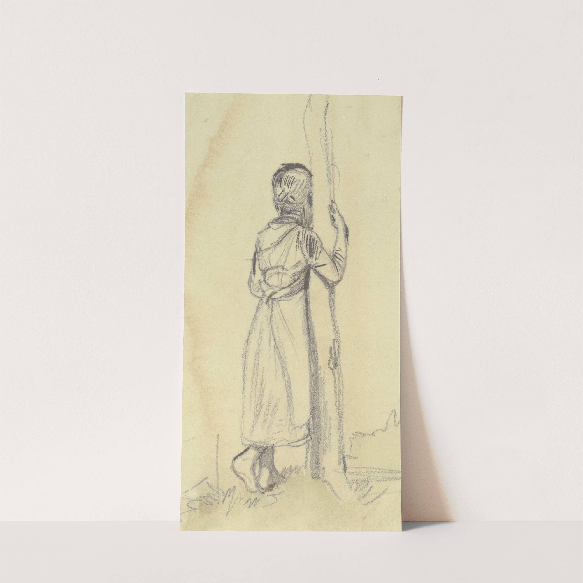 Barfüßiges Mädchen in Rückenansicht, an einen Baumstamm gelehnt und diesen umfassend by Jakob Fürchtegott Dielmann - Wall Art Print