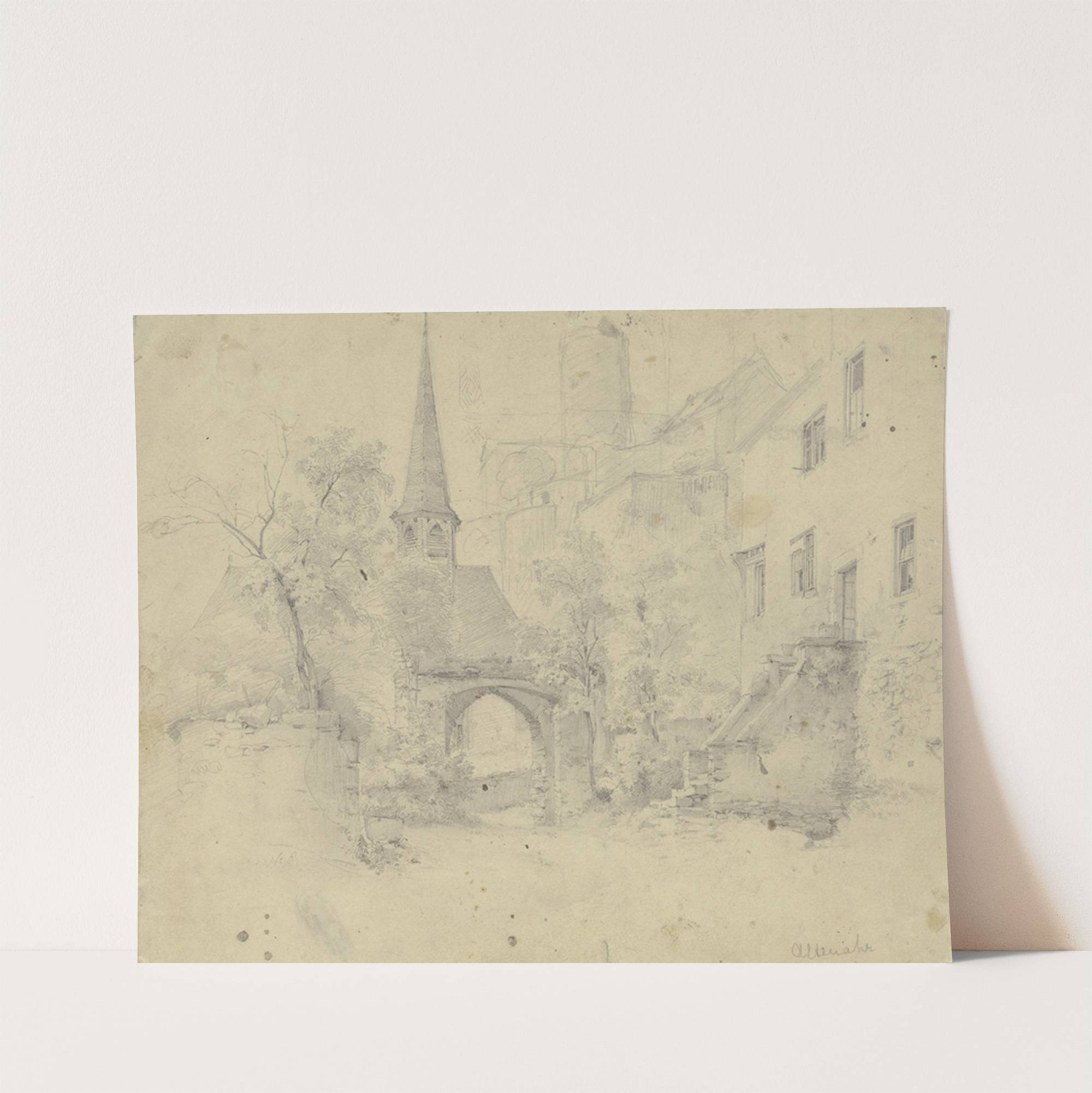 Ein altes Tor, dahinter eine Kirche, rechts ein Haus mit hoher Treppe, darüber ein altes Schloss by Jakob Fürchtegott Dielmann - Wall Art Print