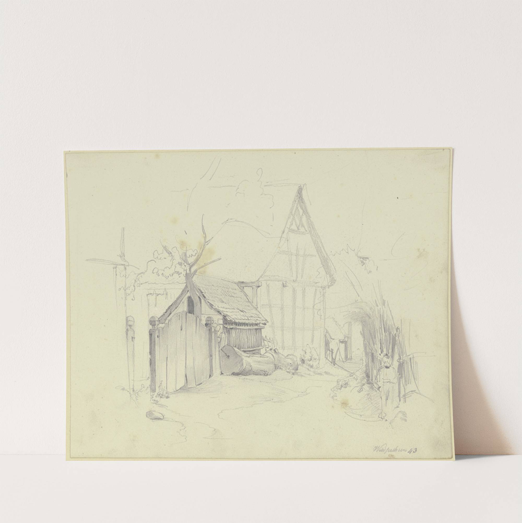 Straße im Dorf, links ein verschlossenes Holztor und eine offene Tür, rechts am Zaun eine Linde by Jakob Fürchtegott Dielmann - Wall Art Print