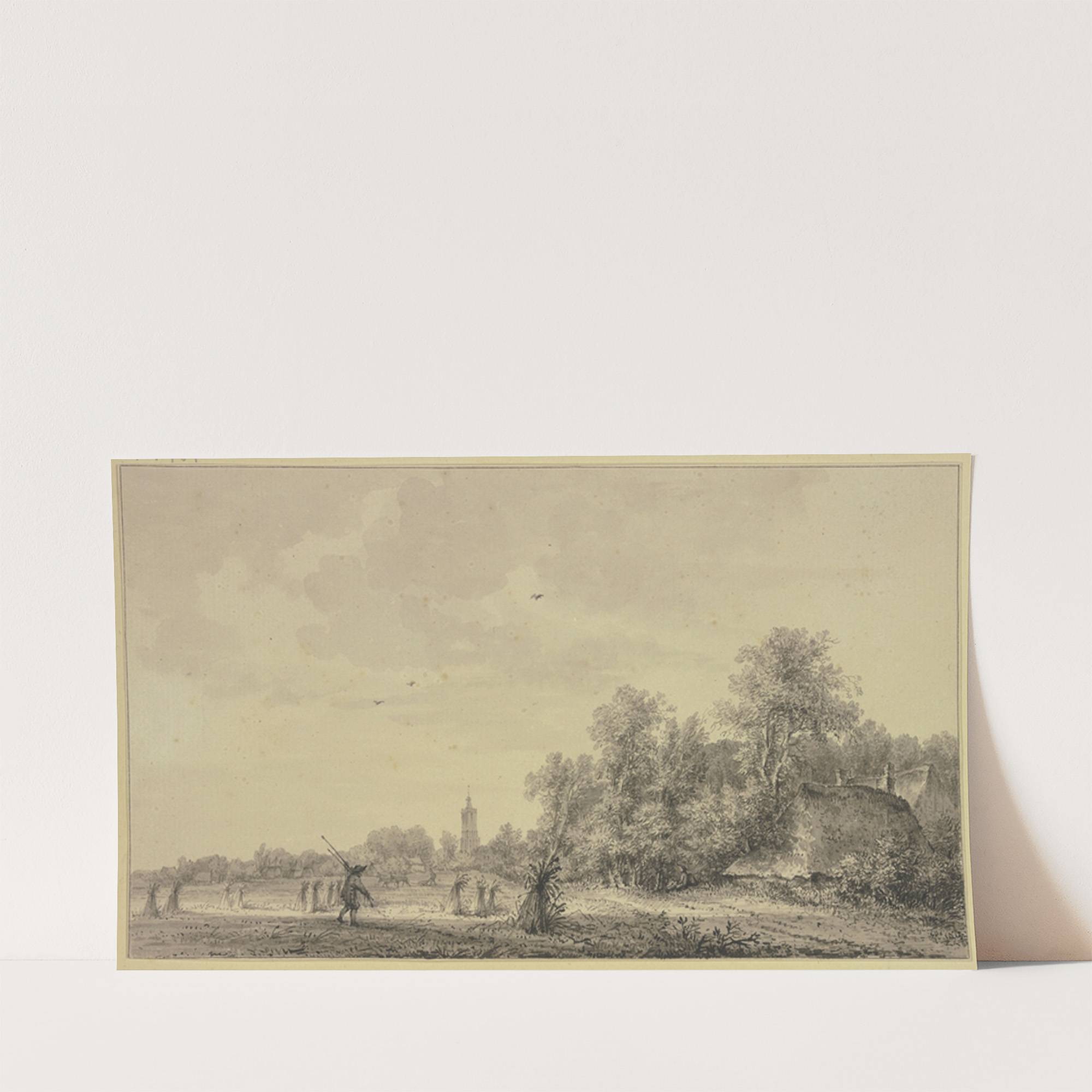 Auf einem Felde stehen Fruchtgarben, im Hintergrunde geht der Pflug, vorne trägt ein Mann zwei Stangen by Jakob Versteegs - Wall Art Print