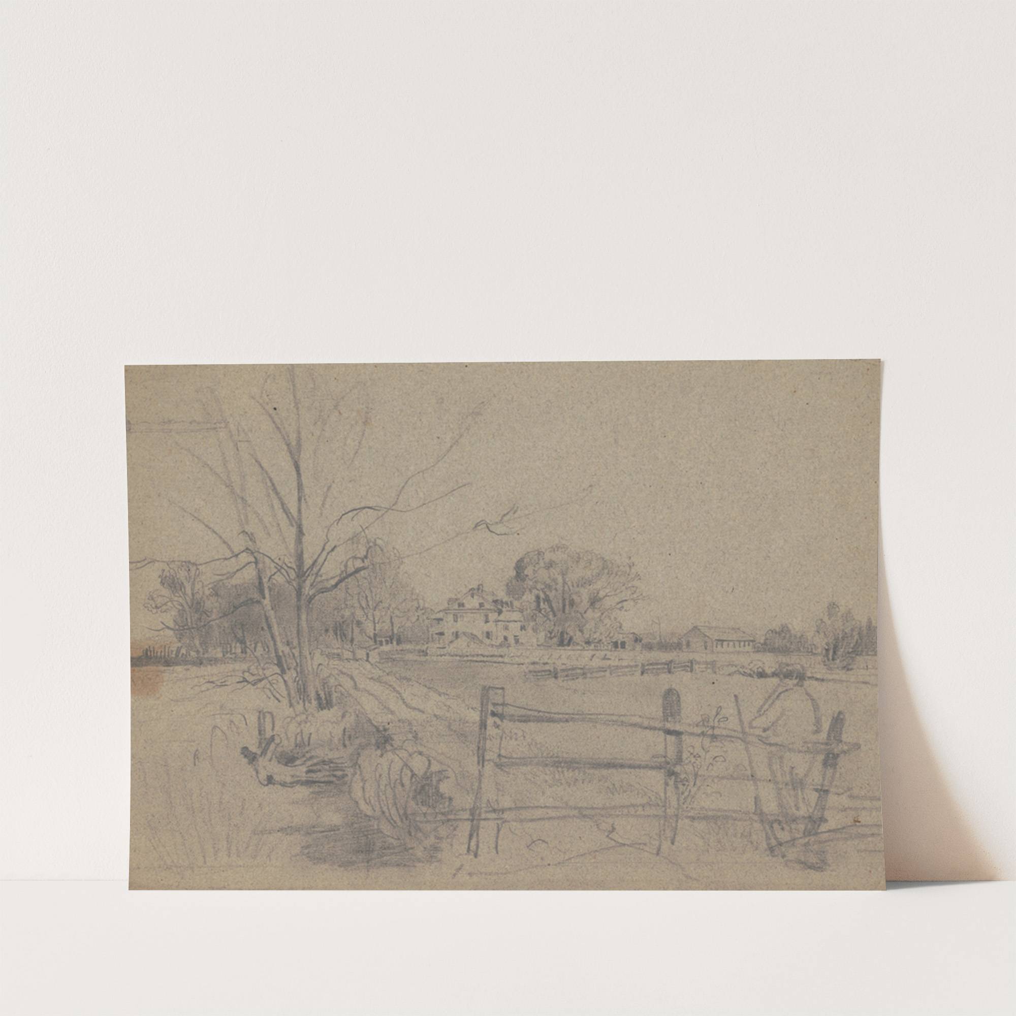 Man with rifle leaning against fence near house with outbuildings (1840-1860) by James Fuller Queen - Wall Art Print