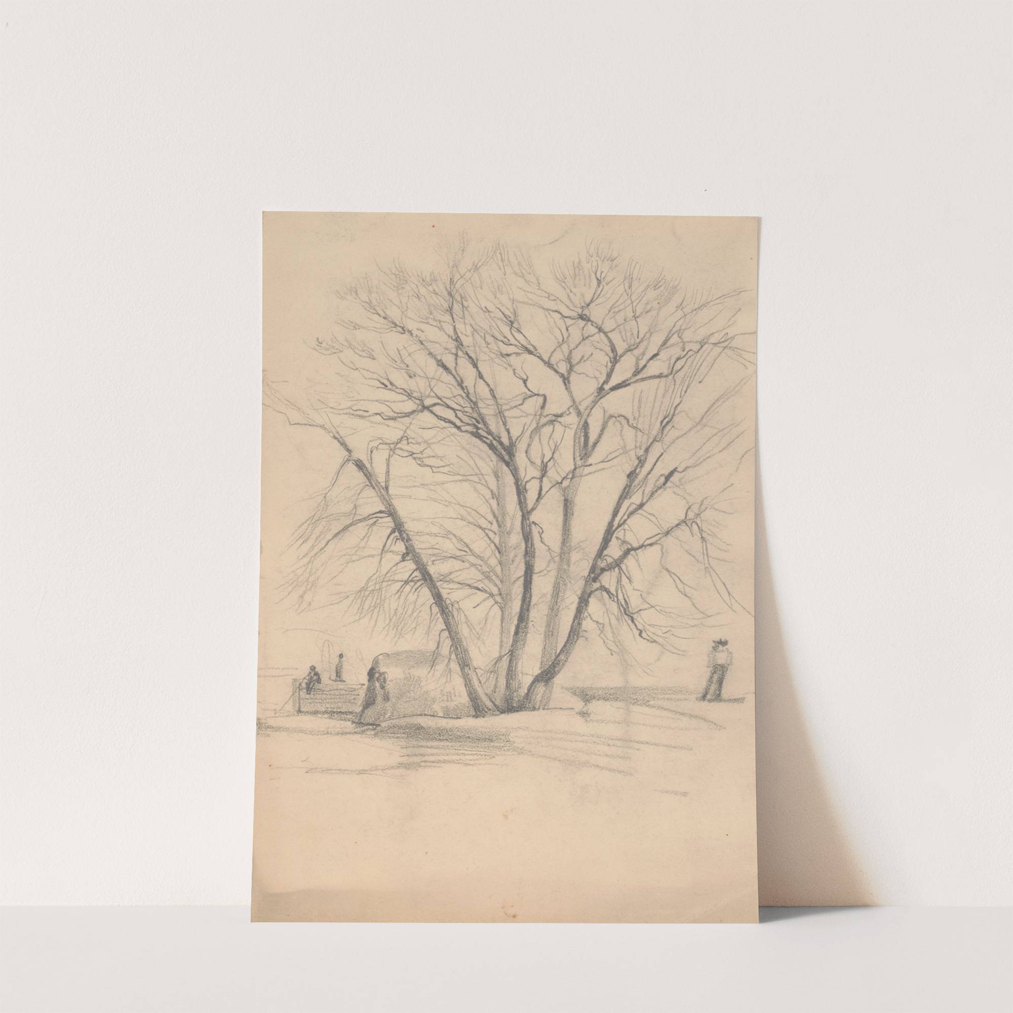 Sketch of a tree in winter beside a boulder at water’s edge, a man fishes from a wharf in the background (1840-1860) by James Fuller Queen - Wall Art Print