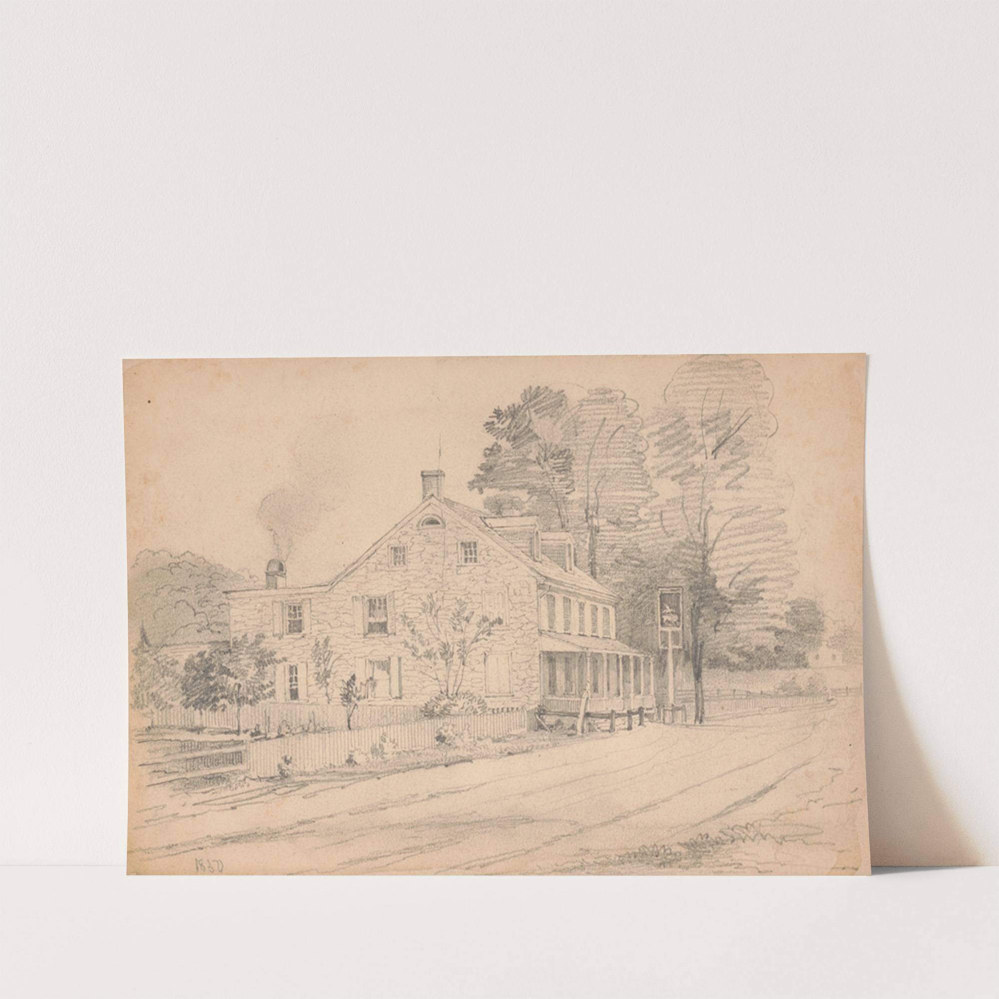 Stone tavern on a dirt road, smoke coming out of chimney at rear of building, sign at front shows a bird riding on the back of an animal (1850) by James Fuller Queen - Wall Art Print