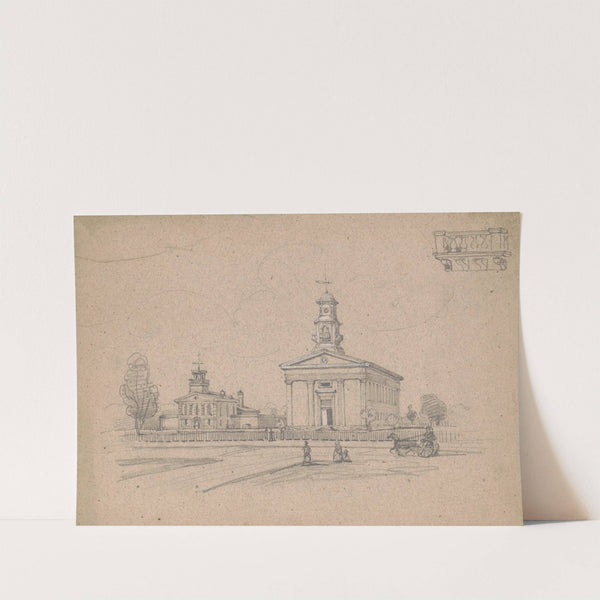 Unidentified church next to a Greek revival home on a city street with fence and pedestrians (1855) by James Fuller Queen - Wall Art Print