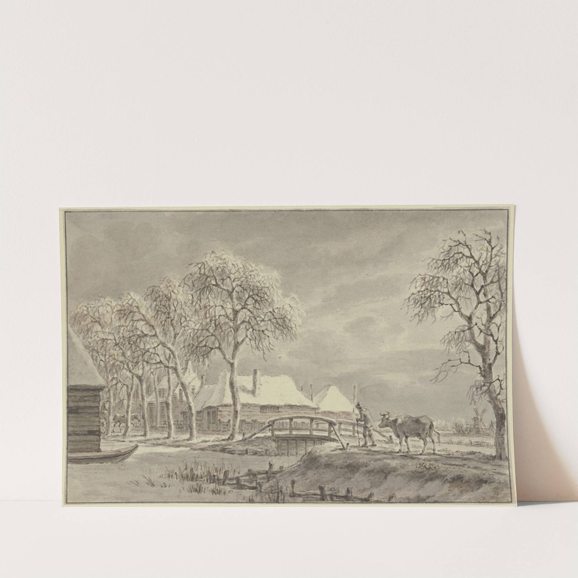 Winterlandschaft, über eine Brücke bei einem Dorf führt ein Bauer eine Kuh by Jan Evert Grave - Wall Art Print
