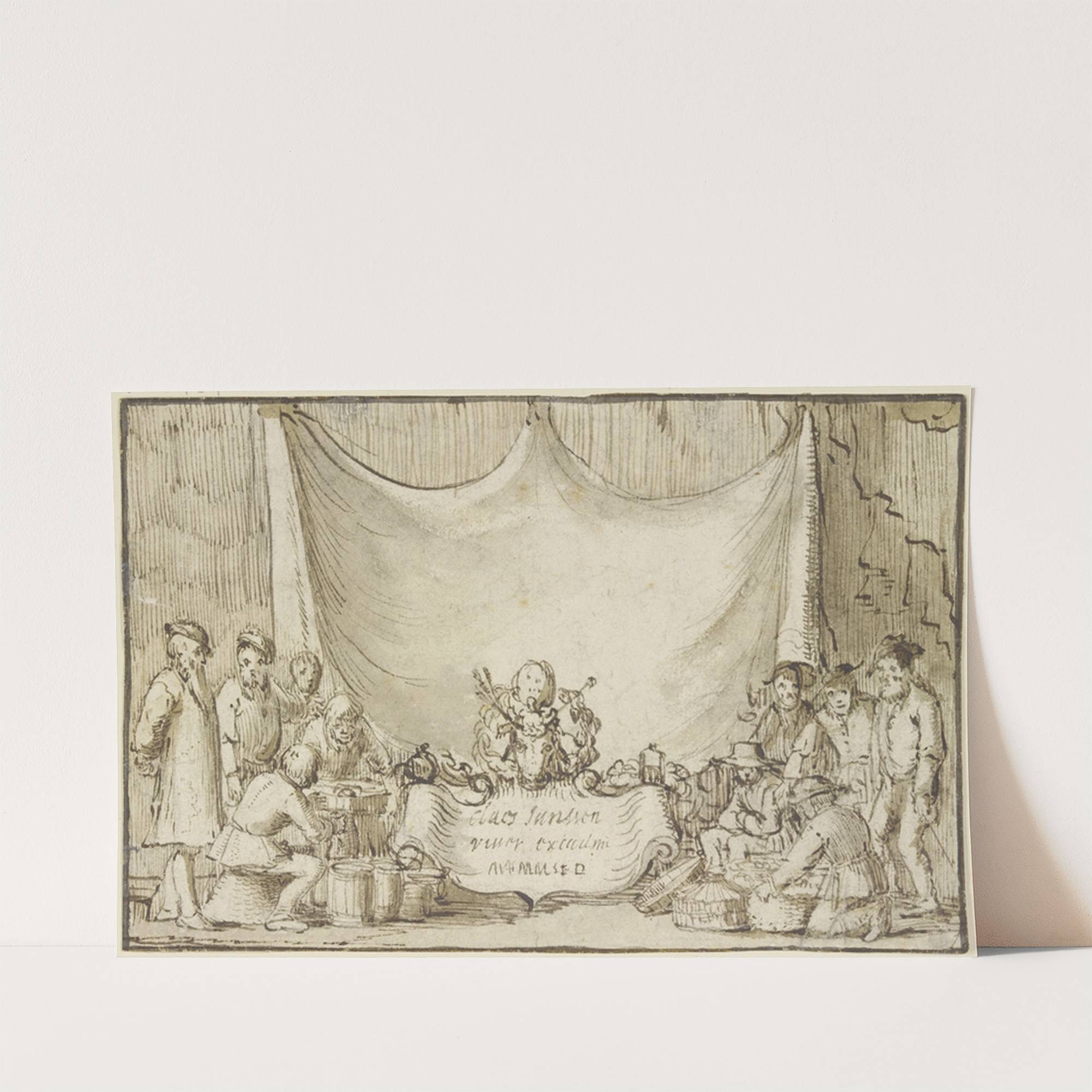Vor einem Vorhang ein Spruchband, darüber ein geschmückter Ochsenkopf, daneben Fischer und Bauern mit Fässern und Körben by Jan van de Velde II - Wall Art Print