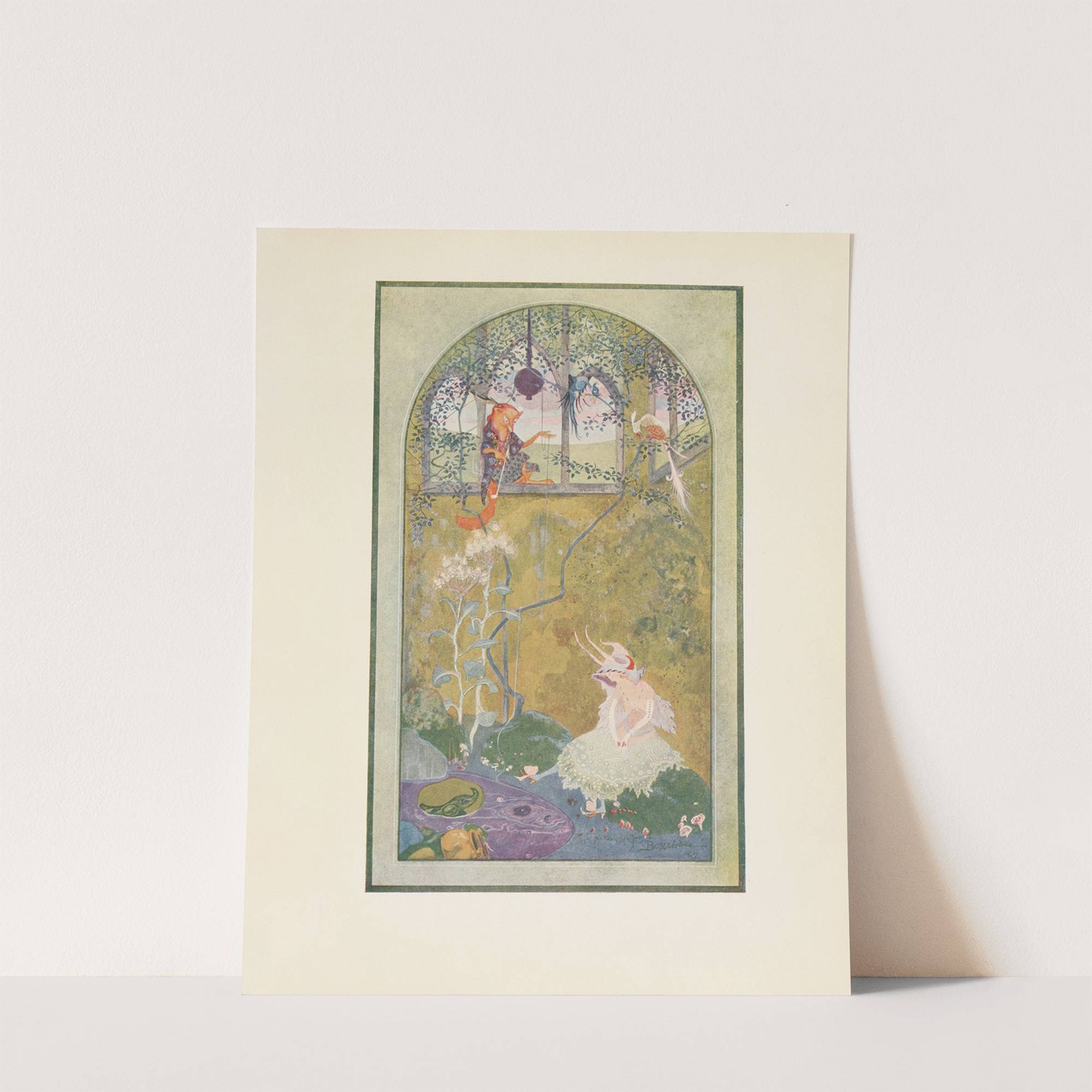 This enchanting art print features "Good-Bye" by Jean de Bosch?re, a beautiful illustration with an intricate, dreamlike quality. The scene is set within a framed arched window that invites viewers into a magical world. At the center, a delicate young...