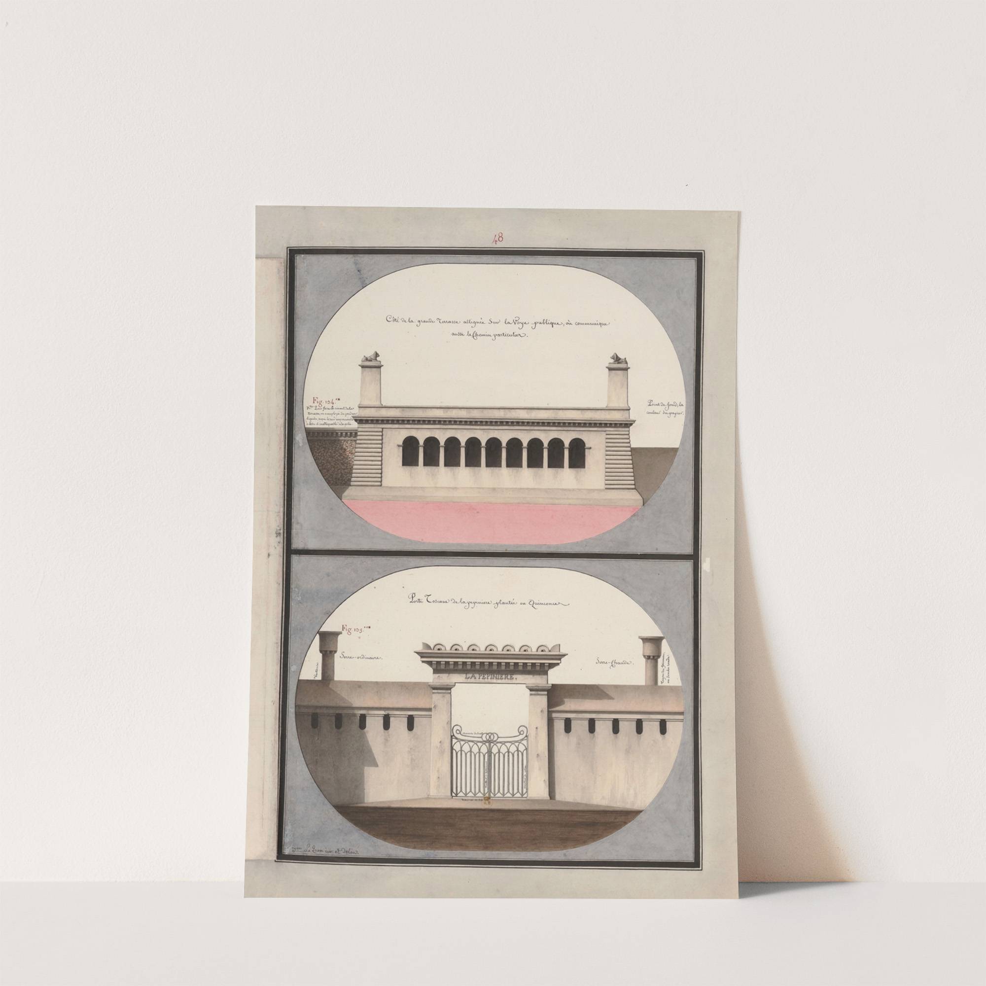 Côté de la grande terrasse allignée sur la voye publique, où communique aussi le chemin particulier ; Porte toscane de la pépinière plantée en quinconce (1777-1825) by Jean Jacques Lequeu - Wall Art Print