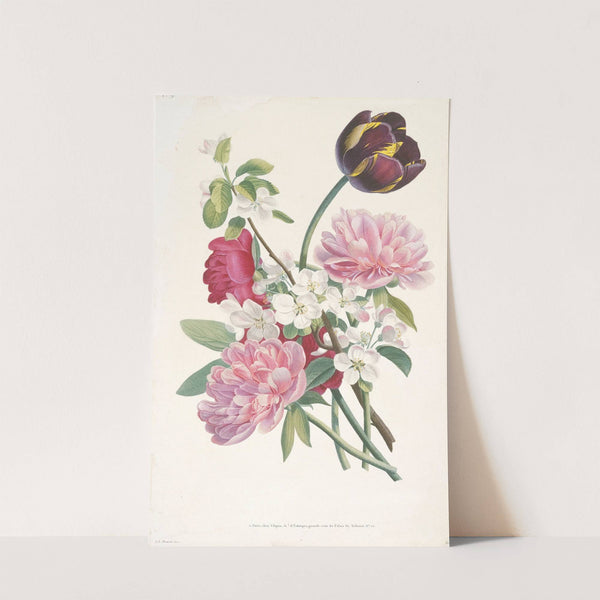 This art print features "Bouquet of Tulip, Peonies, and a Branch from an Apple Tree" by artist Jean-Louis Prévost. The artwork showcases a beautifully detailed floral arrangement against a clean white background. Prominent in the composition are pink peonies with...