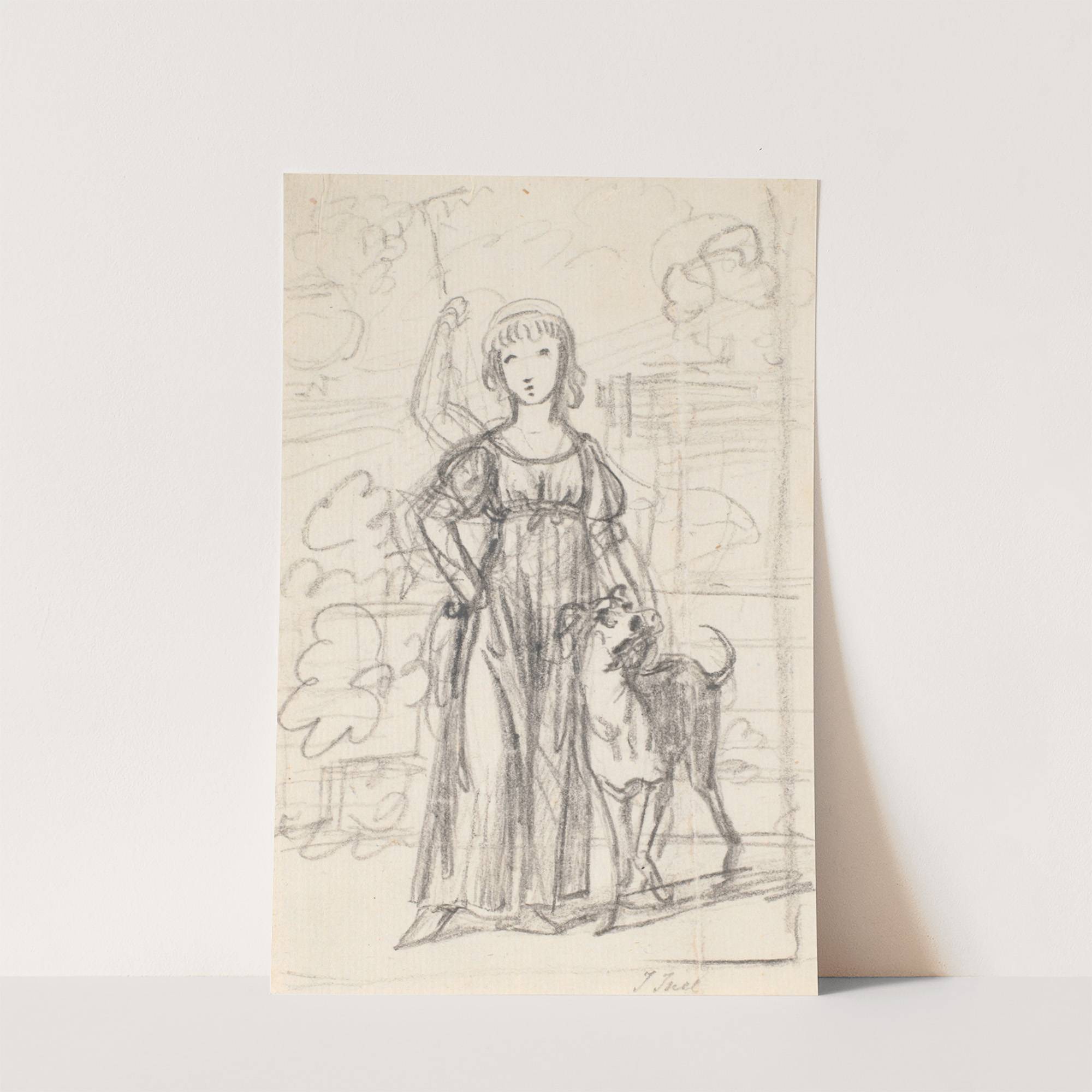 Kompositionsudkast til et portræt af en ung pige med højre hånd i siden og venstre arm om halsen på sin hund, stående ved en havetrappe (1790 – 1799) by Jens Juel - Wall Art Print