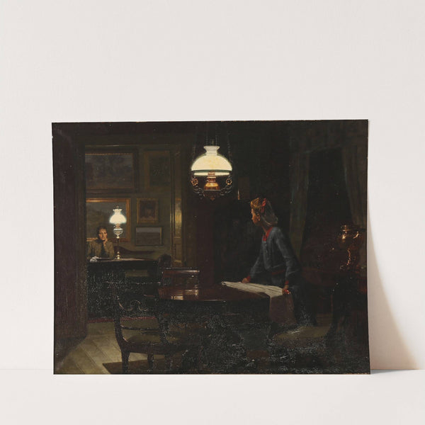 Interiør med to kvinder i petroleumslampens skær by Johan Christopher Schlichtkrull - Wall Art Print