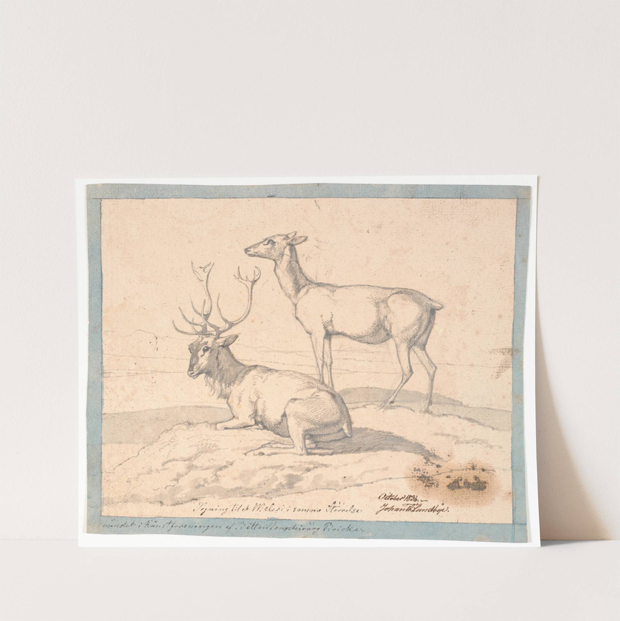 En liggende hjort og en stående hind by Johan Thomas Lundbye - Wall Art Print