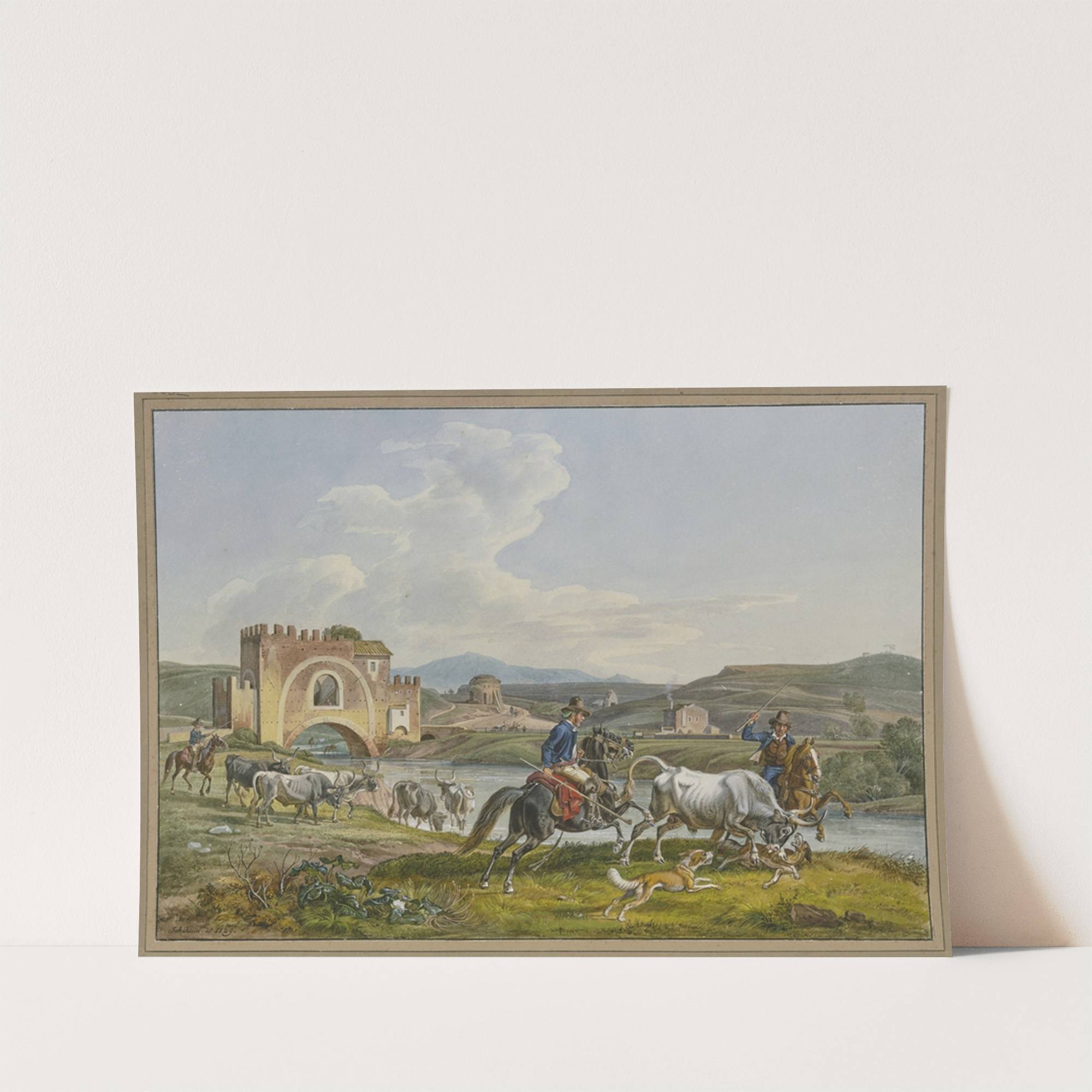 Römische Campagnoli zu Pferde fangen mit Hunden einen Stier ein by Johann Adam Klein - Wall Art Print