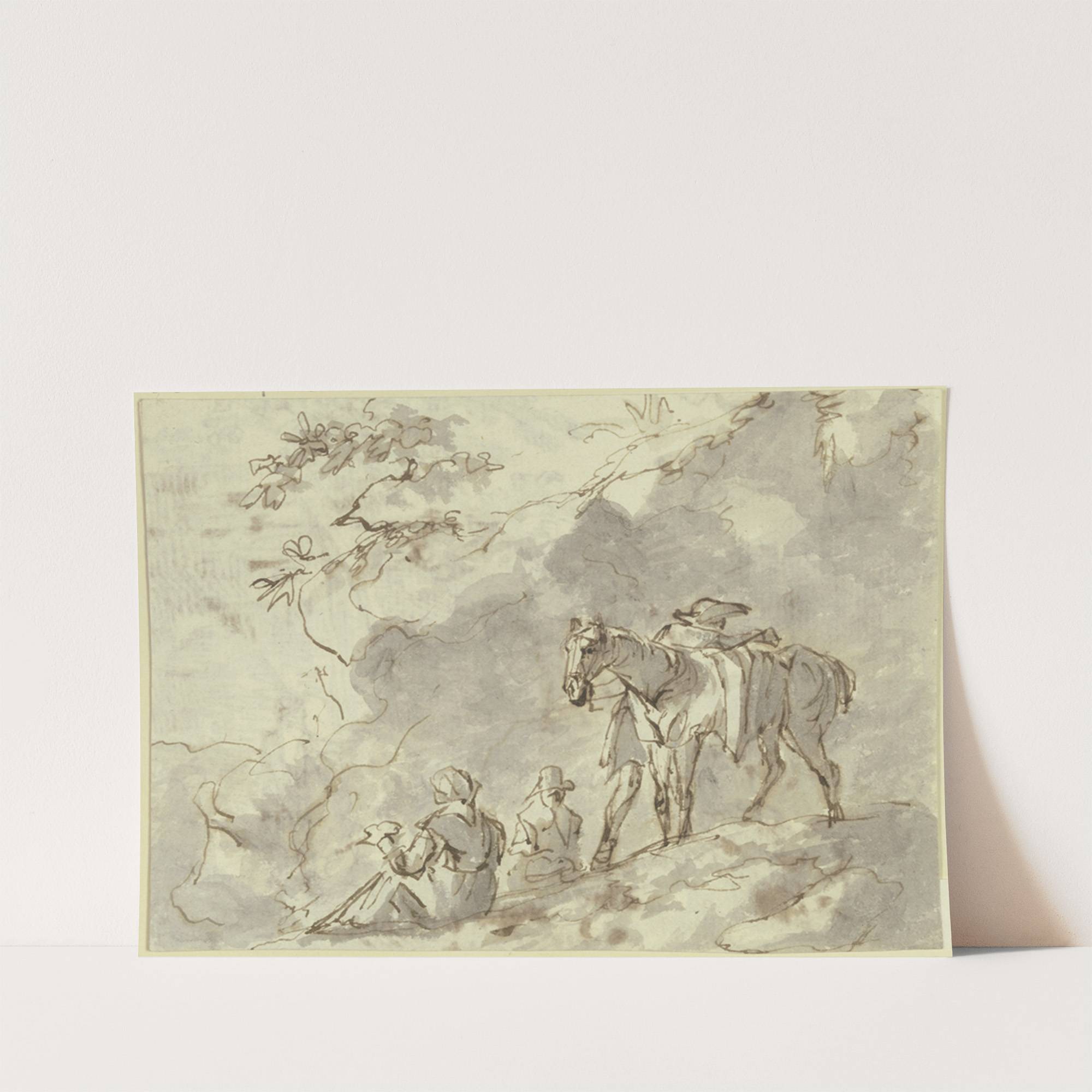 Felshang, davor ein Pferd, dem ein Reiter aufsitzen will, am Boden zwei sitzende Figuren by Johann Andreas Herrlein - Wall Art Print