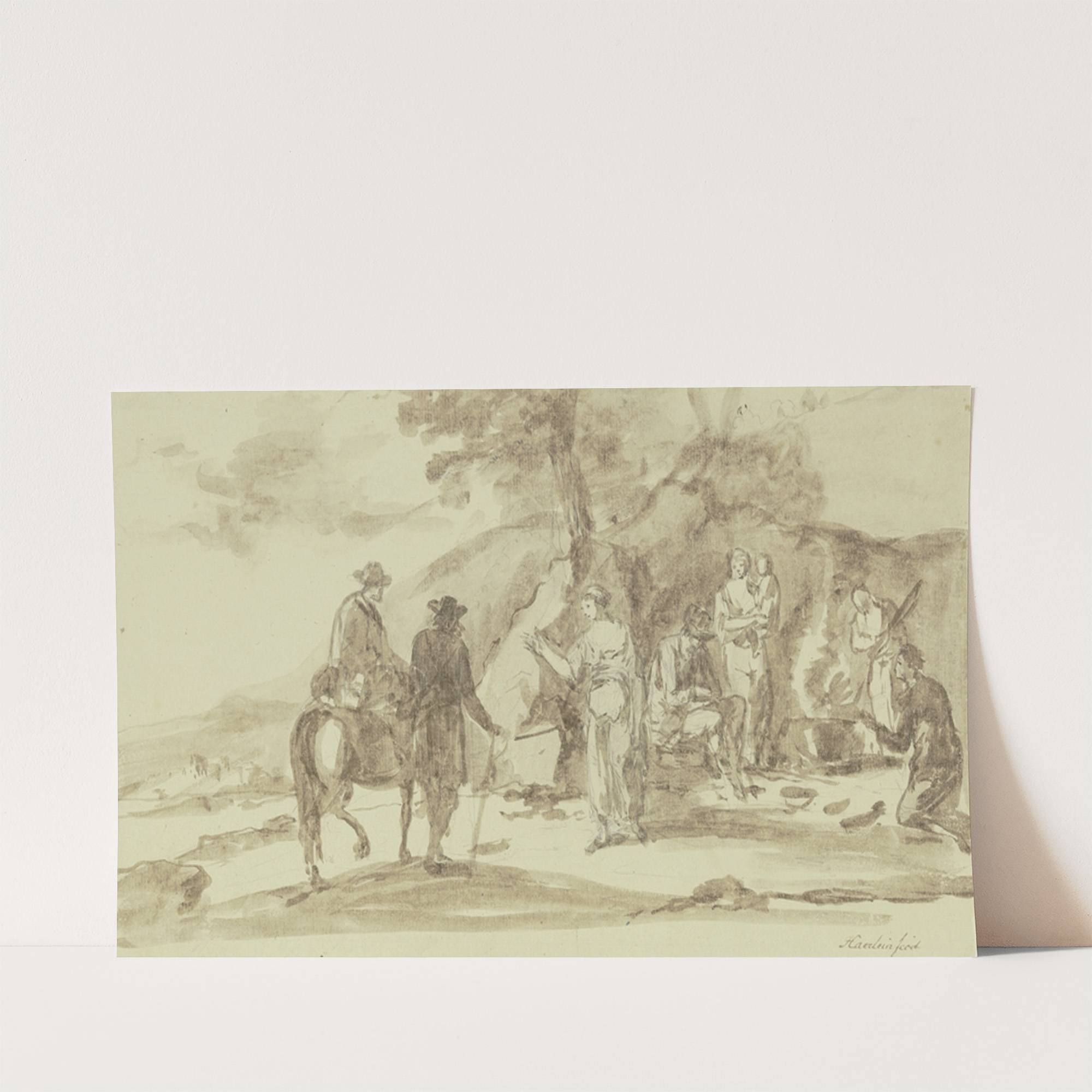 Rechts an einem Berghang eine Gruppe von vier Personen mit einem Kind bei einer Feuerstelle by Johann Andreas Herrlein - Wall Art Print