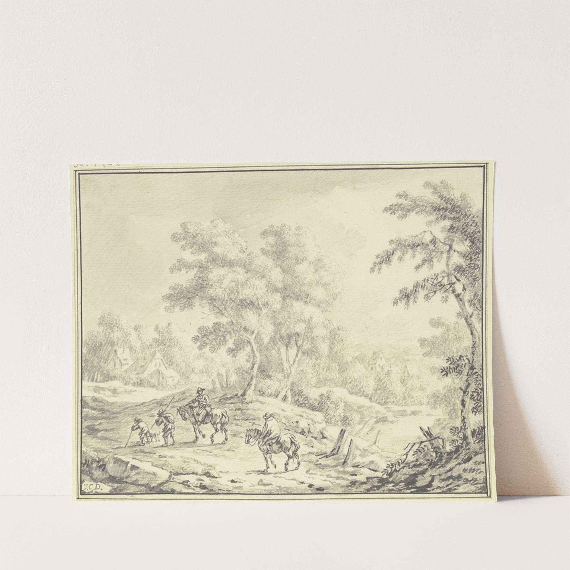 Bewaldete hügelige Landschaft, in der Mitte eine Baumgruppe, hinter der Häuser liegen, im Vordergrund ein Mann und eine Frau zu Pferde mit zwei Begleitern zu Fuß by Johann Christoph Dietzsch - Wall Art Print
