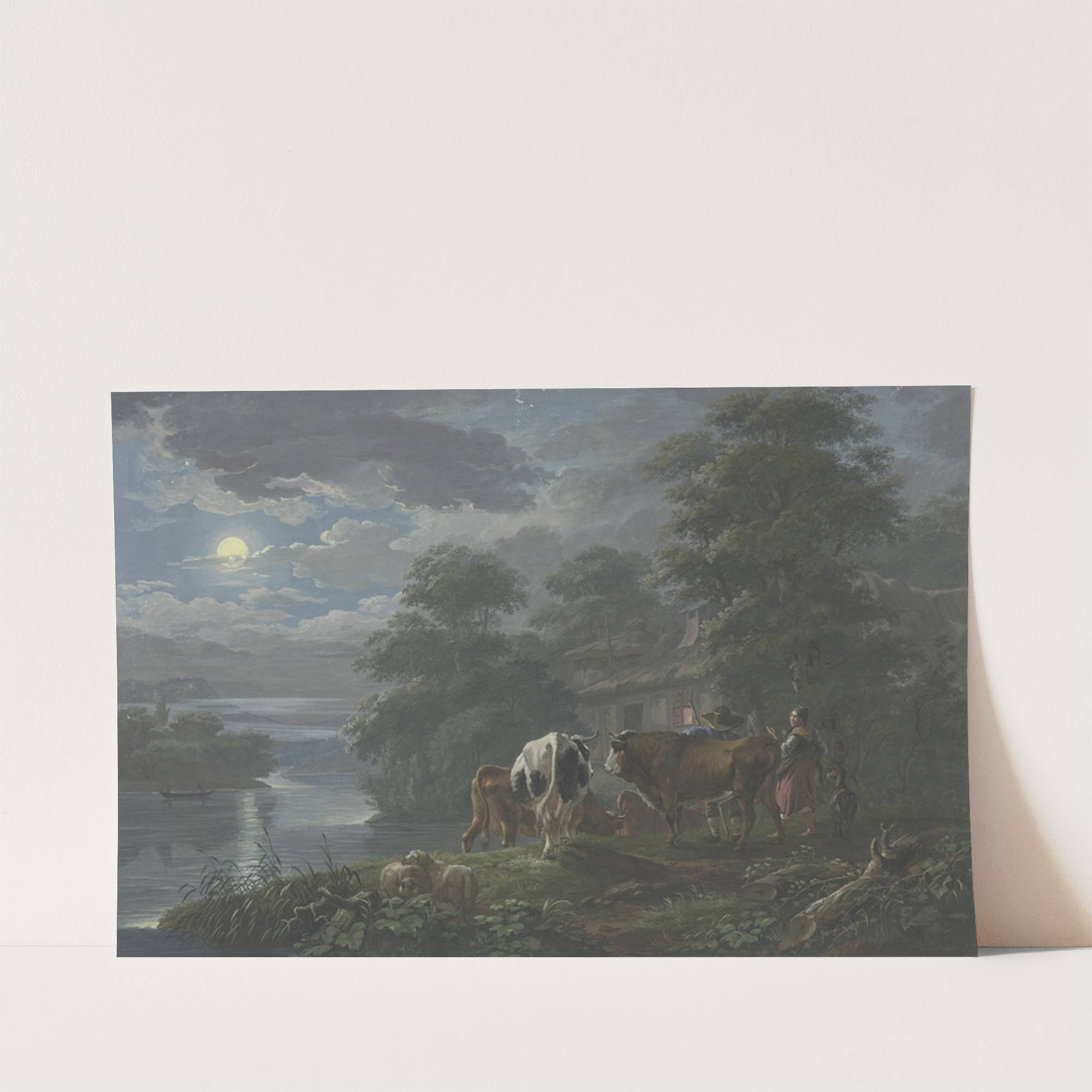 Mondscheinlandschaft an einem Fluß, Hirte und Hirtin treiben das Vieh zum Hof by Johann Georg Pforr - Wall Art Print