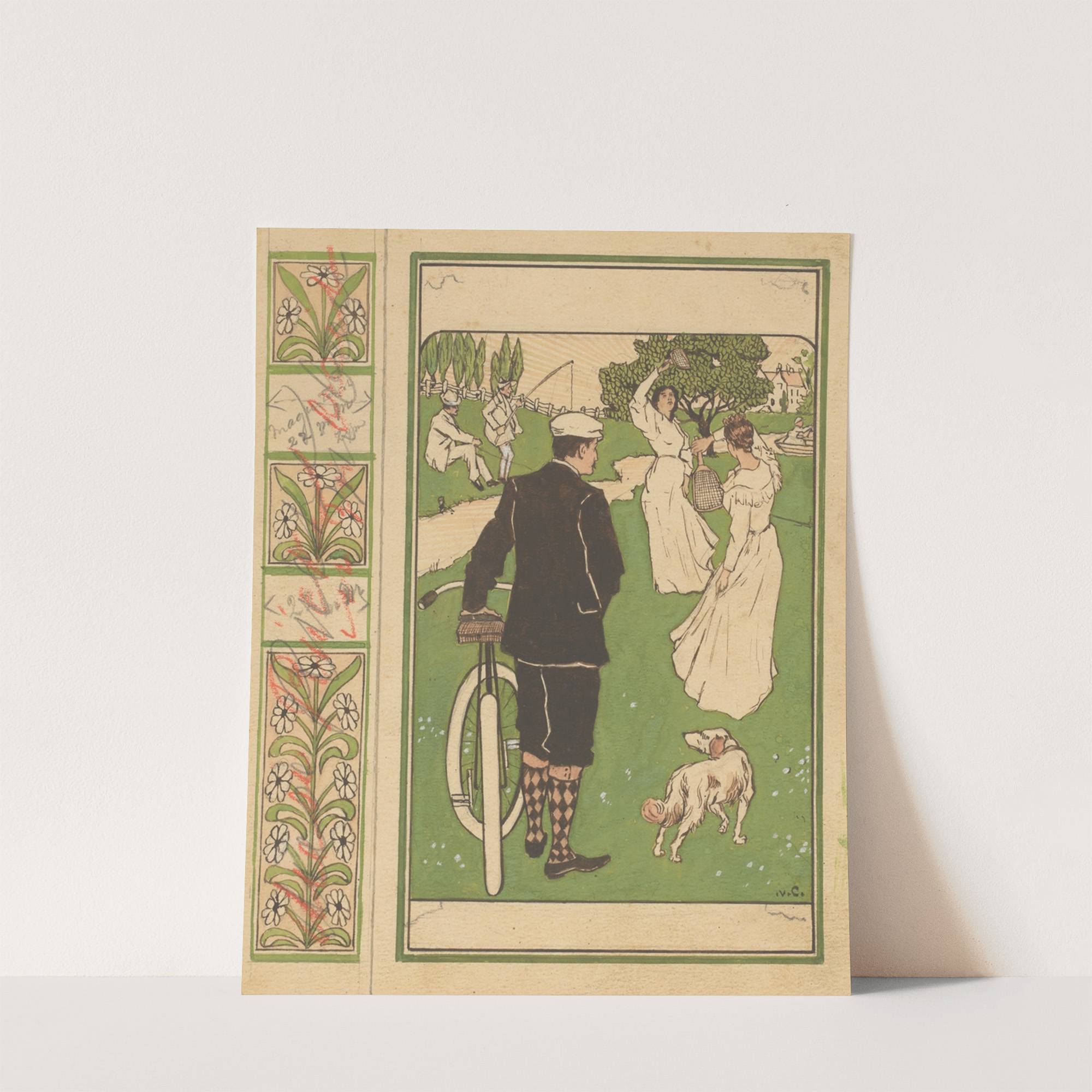 Bandontwerp met man met fiets en badmintonspelers by Johann Georg van Caspel - Wall Art Print