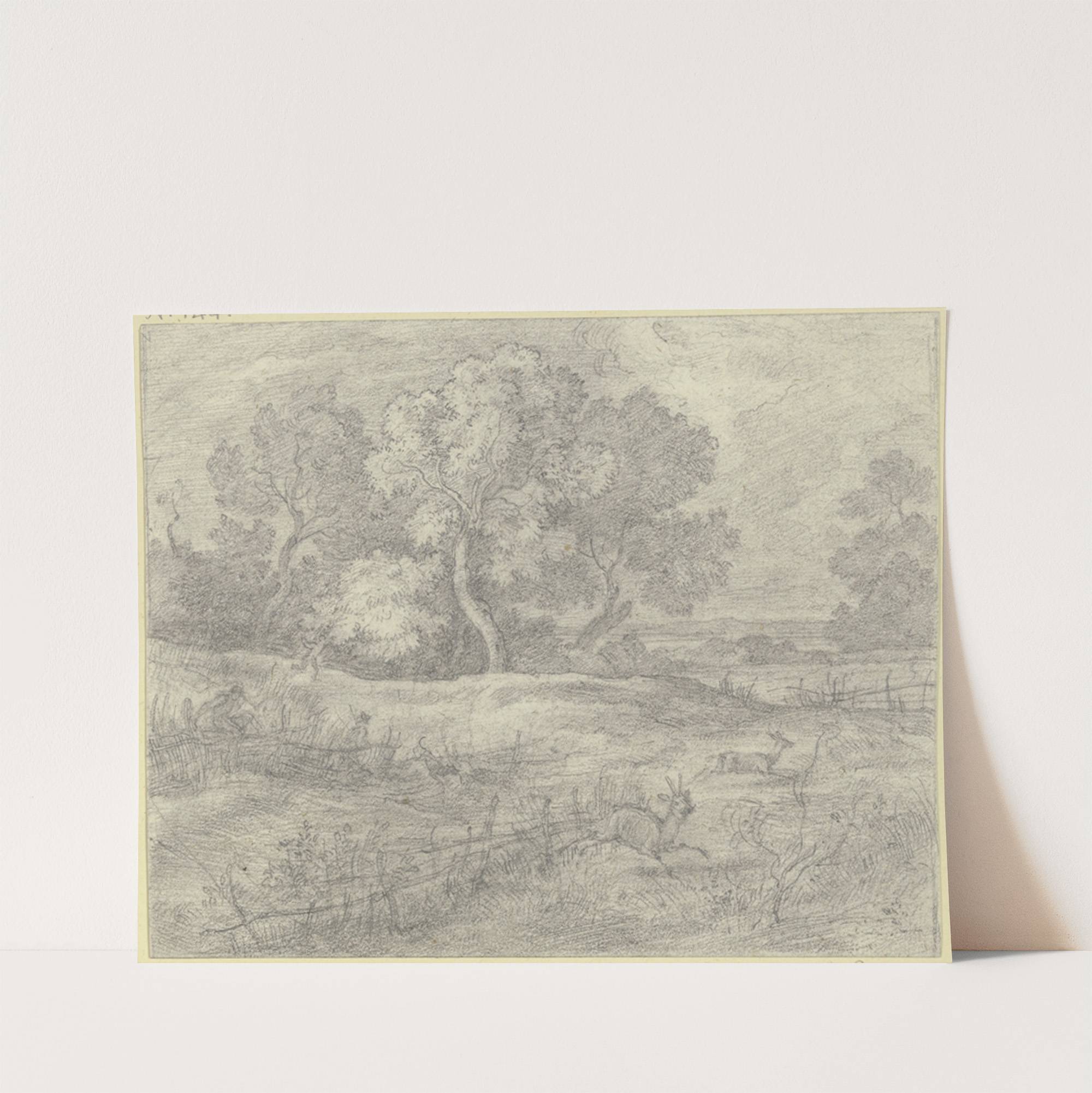 Baumbestandene Wiesenlandschaft, über die Jäger fliehende Rehe verfolgen by Johann Heinrich Ferdinand Olivier - Wall Art Print