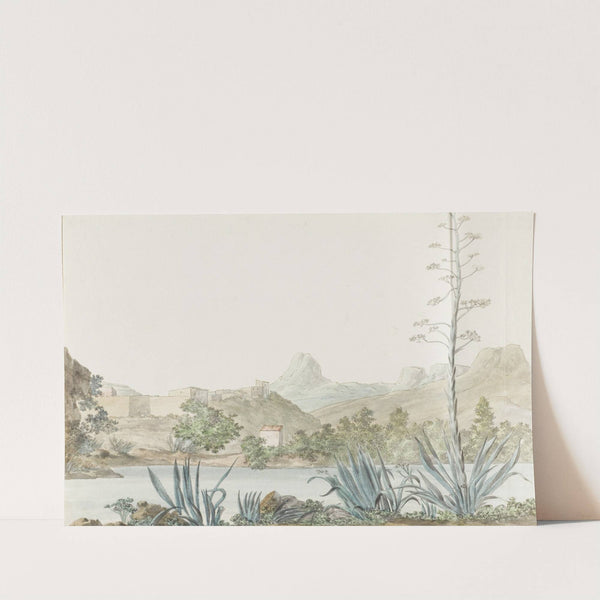 This beautiful watercolor print features "Gezicht op de rivier Platani en Agrigento in Palermo" by Abraham-Louis-Rodolphe Ducros. The artwork captures a serene riverside scene with delicate, soft pastel hues that evoke tranquility and natural beauty. In the foreground, various blue...