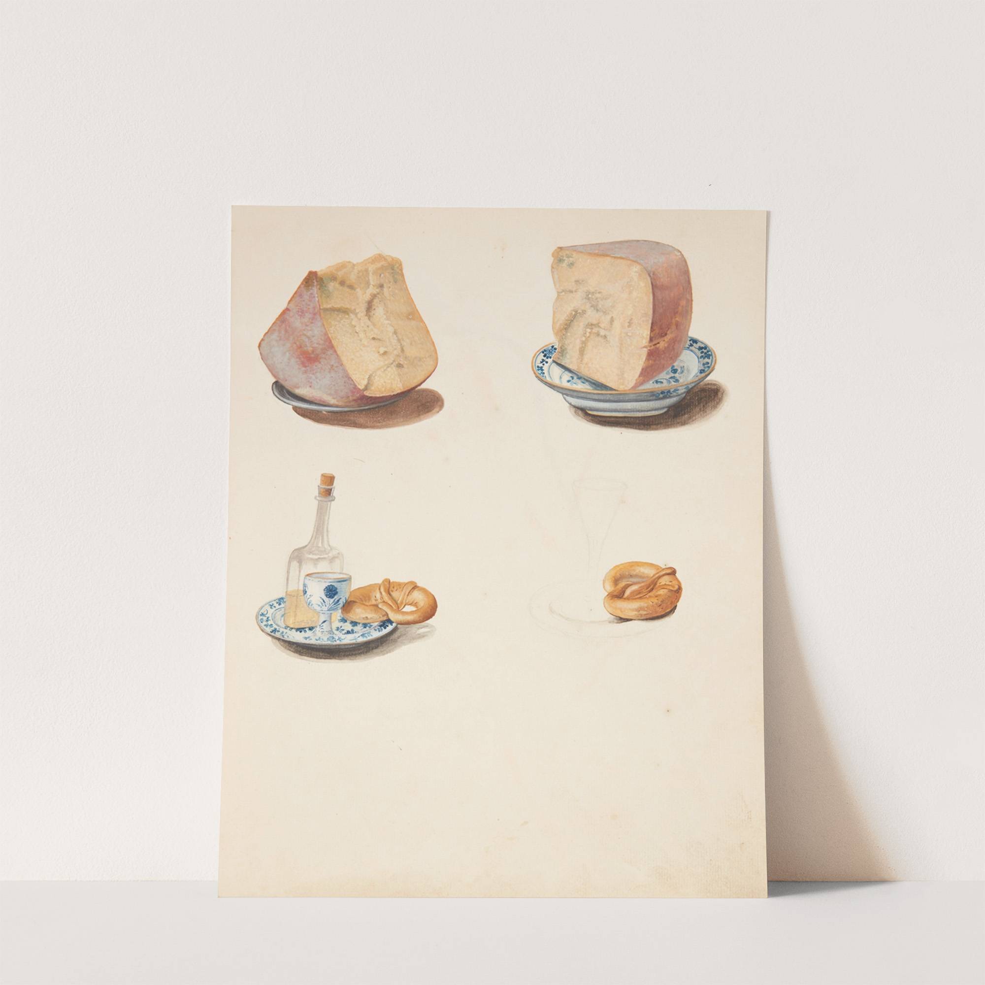 Opstilling med ost, snaps og brezel by Johanna Fosie - Wall Art Print