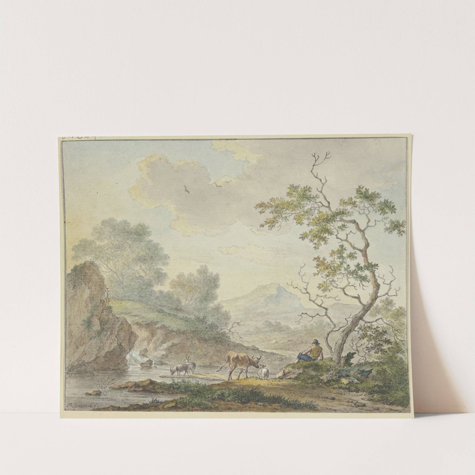 Bei einem Wasserfall ein Hirte mit einer Kuh und Ziegen by Johannes Christiaan Janson - Wall Art Print